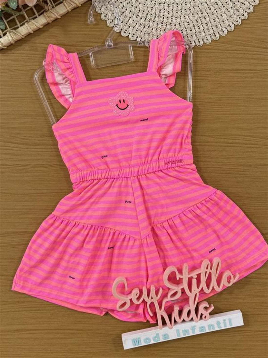 Macação Curto Infantil Momi Rosa Listrado Florzinha