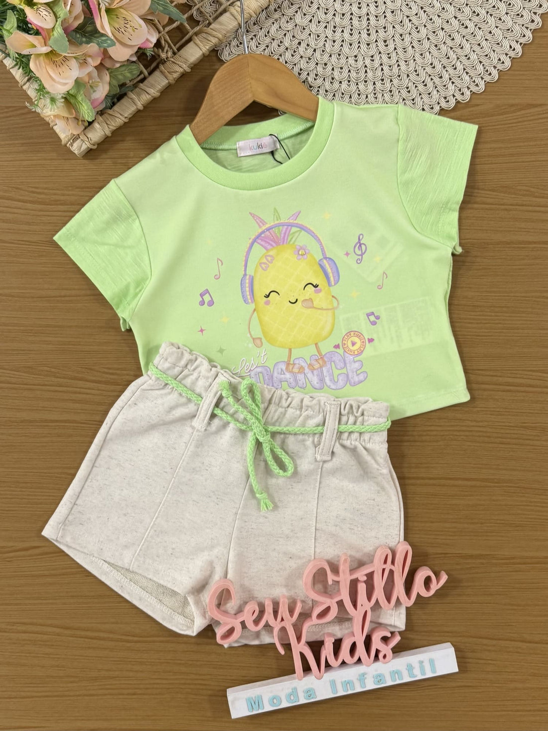 Conjunto Infantil Kukiê Verão com Shorts Off White e Blusa Verde Abacaxi Musical