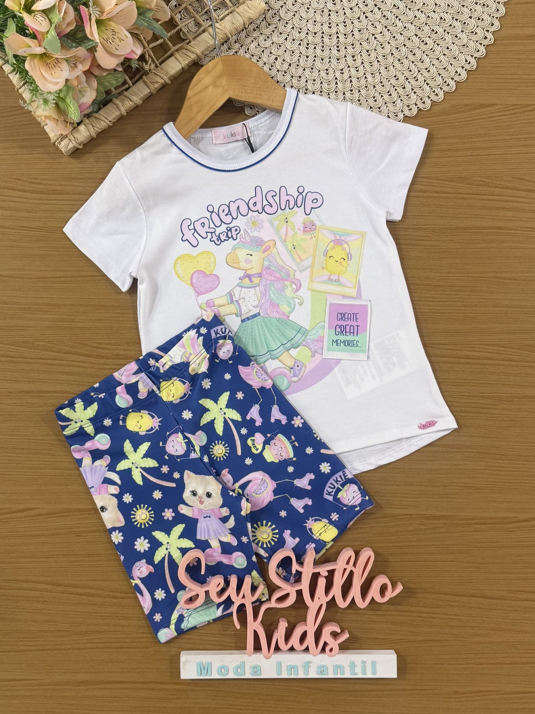 Conjunto Infantil Kukiê Verão com Shorts Ciclista Azul e Blusa Branca Friends Ship