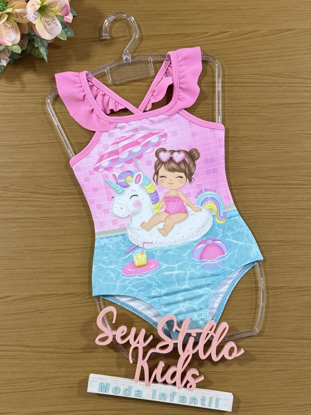 Maiô Infantil Kukie Verão Rosa Menina na Piscina