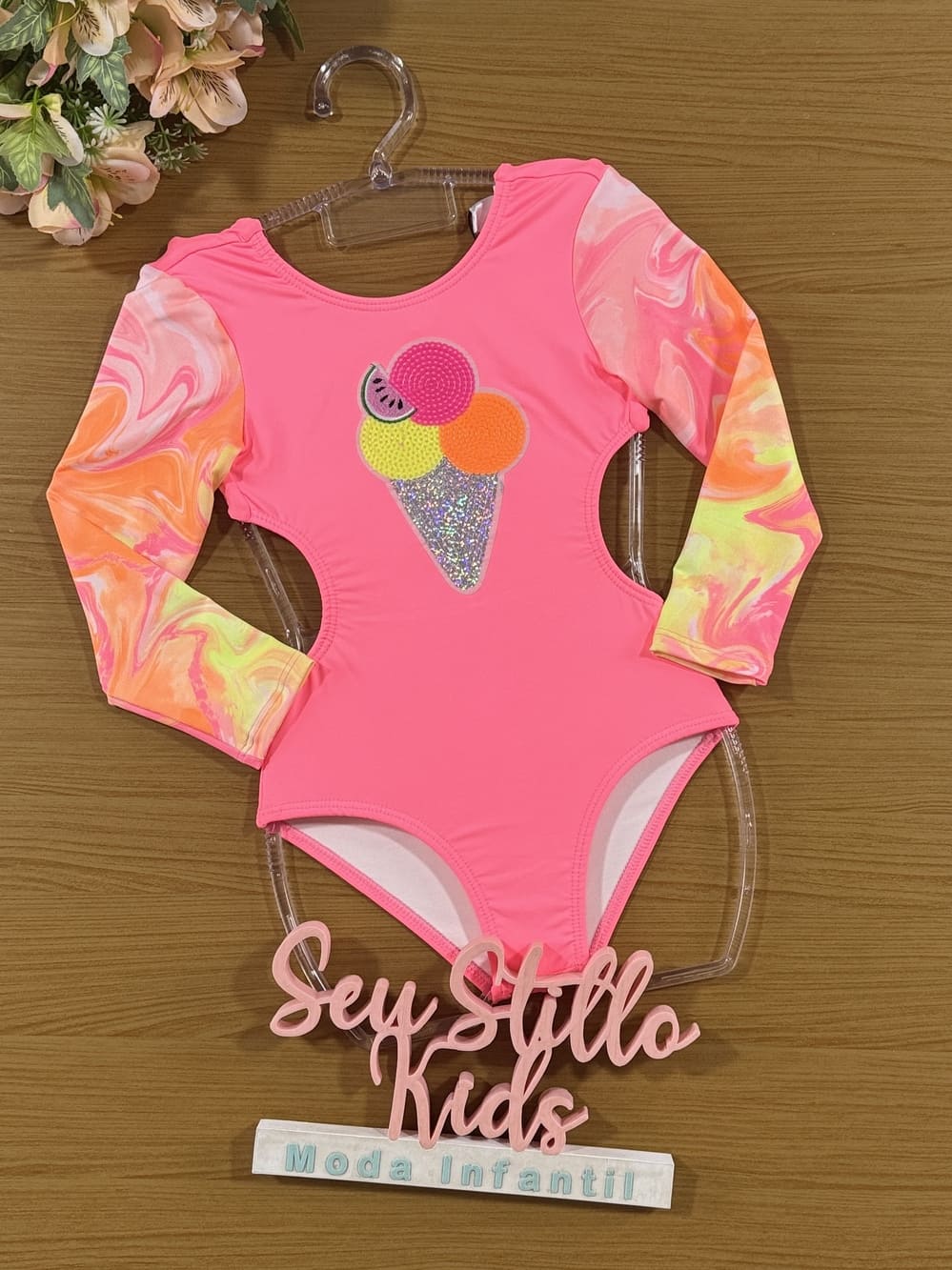 Maiô Infantil Kukie Verão Manga Longa Rosa Sorvete