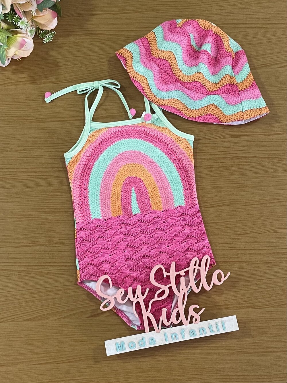 Maiô Infantil Kukie Verão Crochê 3D com Chapéu