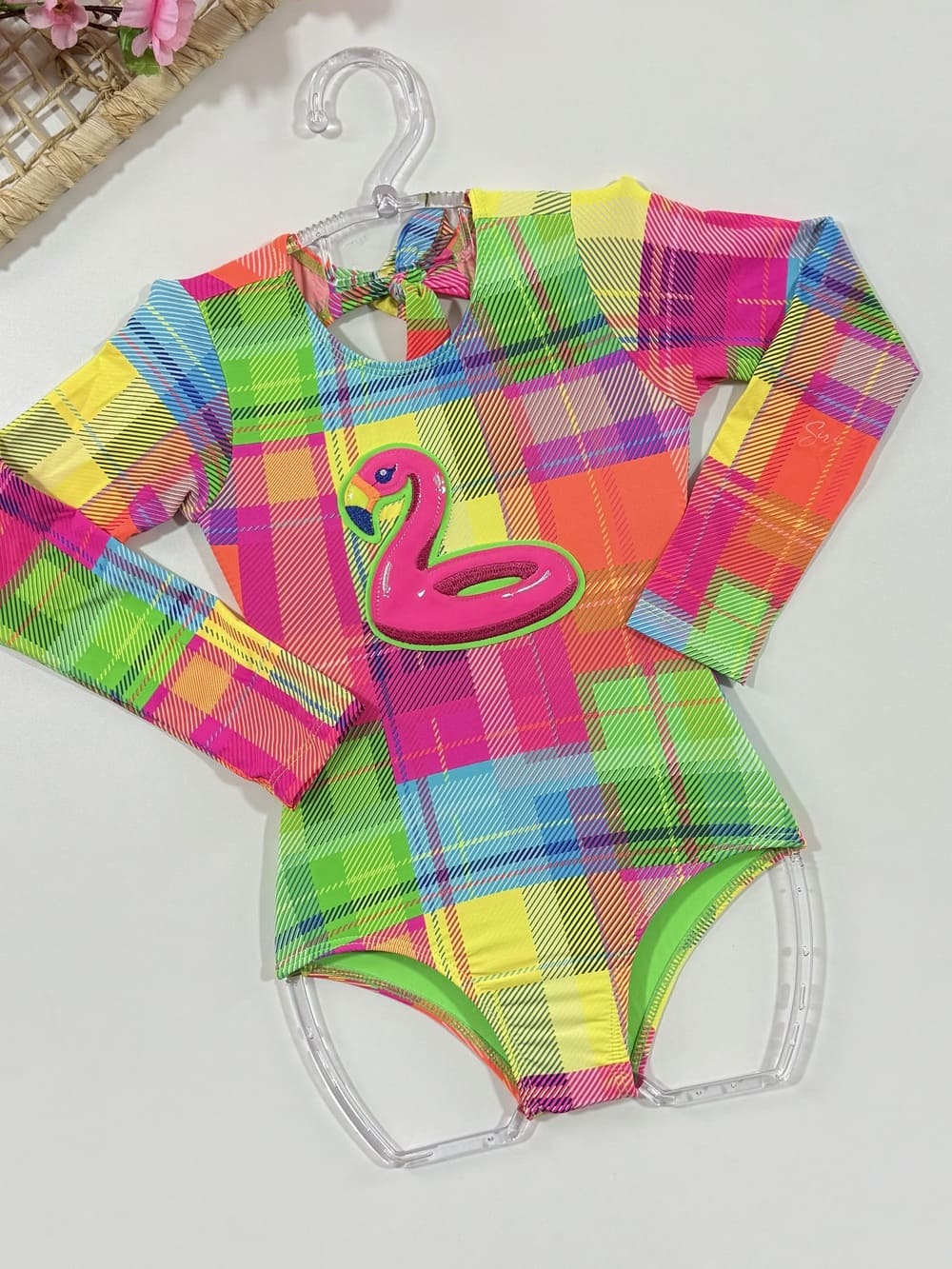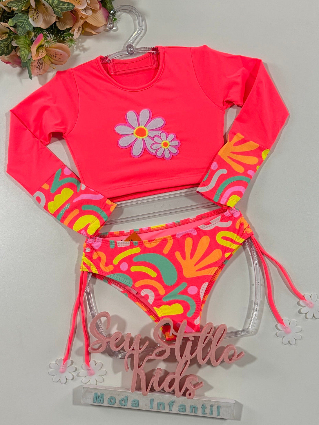Biquíni Infantil Kukie Verão Com Blusa Manga Longa Rosa e Top Florzinha Neon