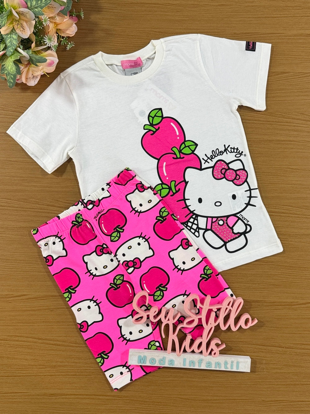 Conjunto Infantil Momi Verão Shorts Ciclista Rosa e Blusa Hello Kitty