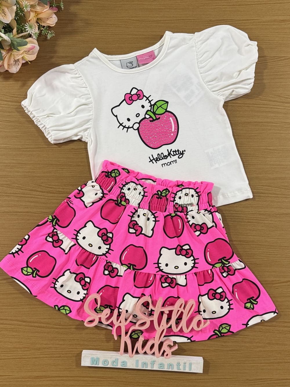 Conjunto Infantil Momi Verão Saia Rosa e Blusa Hello Kitty