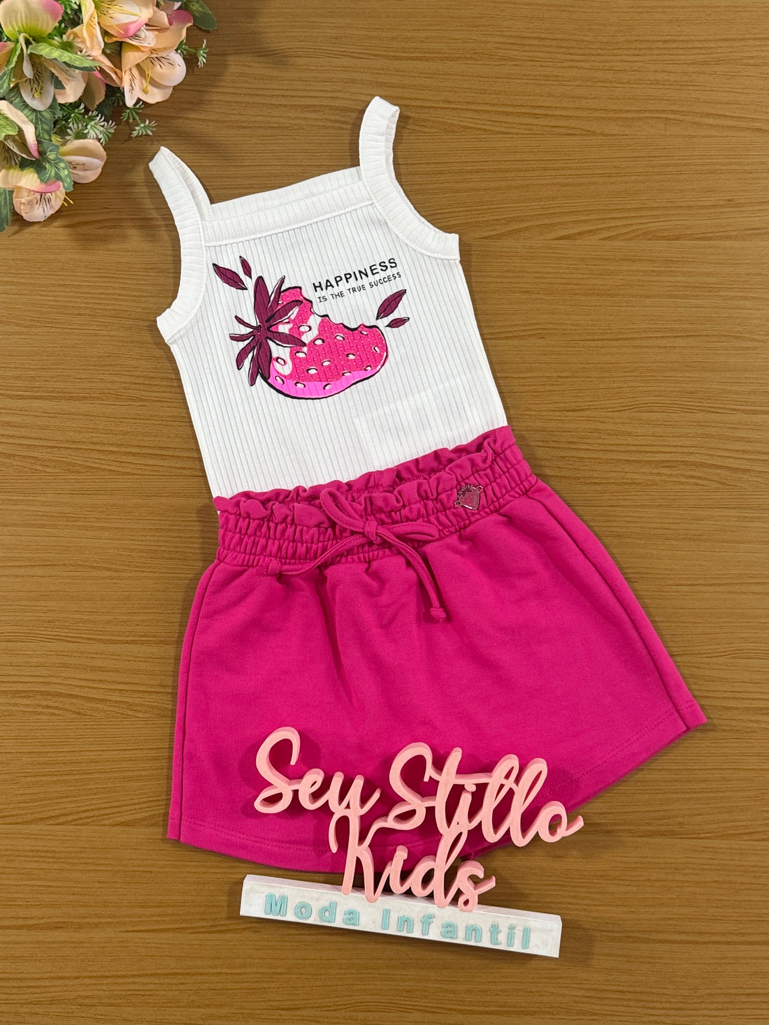 Conjunto Infantil Momi Verão Shorts Saia Rosa e Regata Morango
