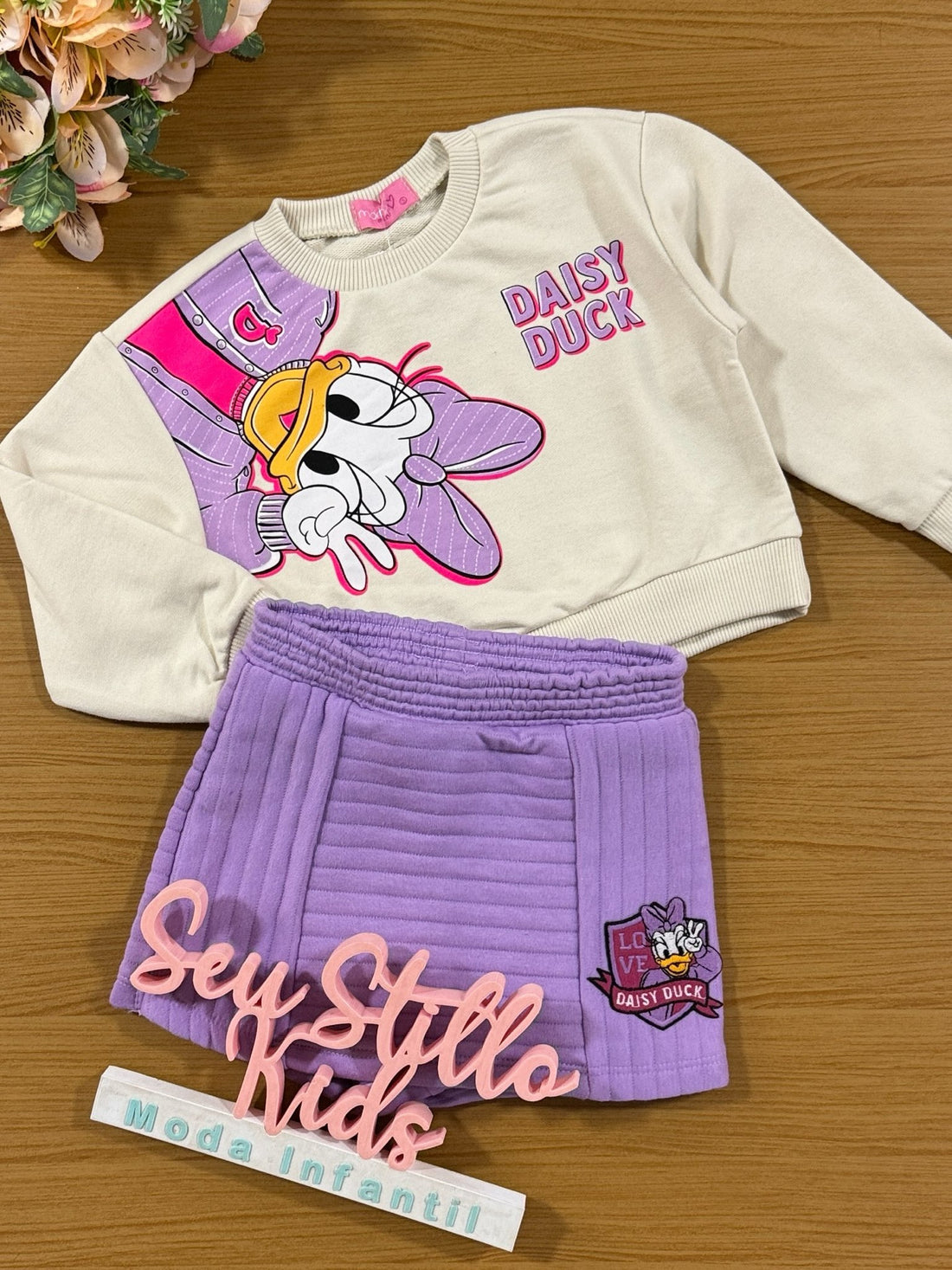 Conjunto Infantil Momi Inverno Shorts Saia Lilás e Moletom Daisy Disney