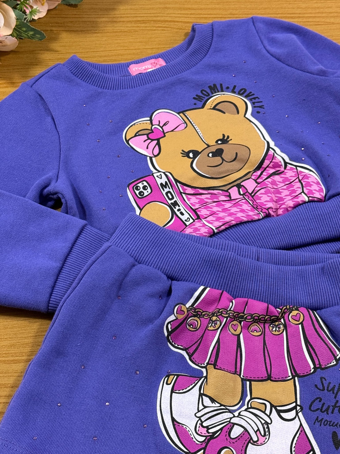 Conjunto Infantil Momi Inverno Shorts Saia Lilás e Moletom Flanelado Ursinha Cute