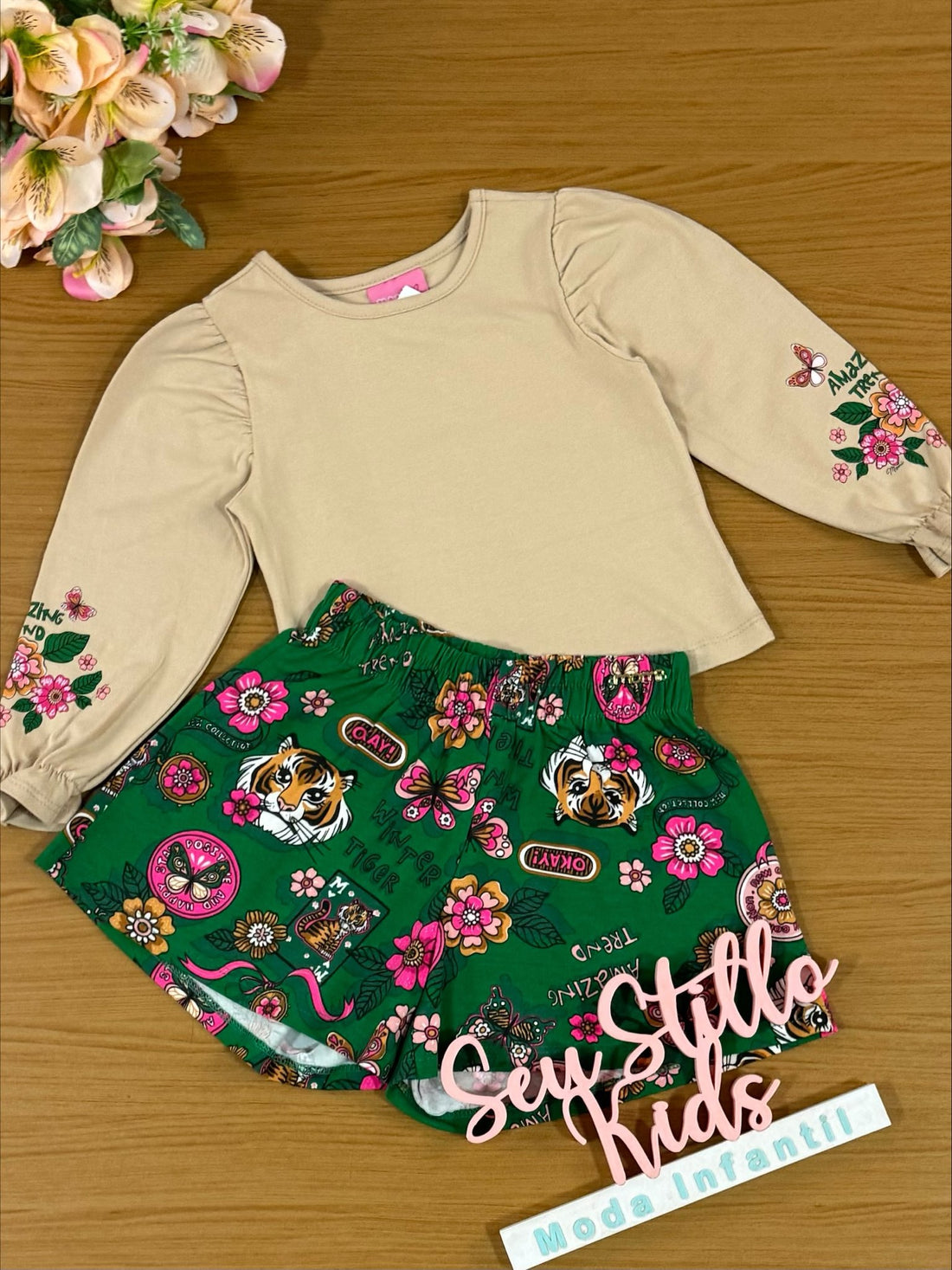 Conjunto Infantil Momi Inverno Shorts Saia e Blusa Manga Curta Tigre