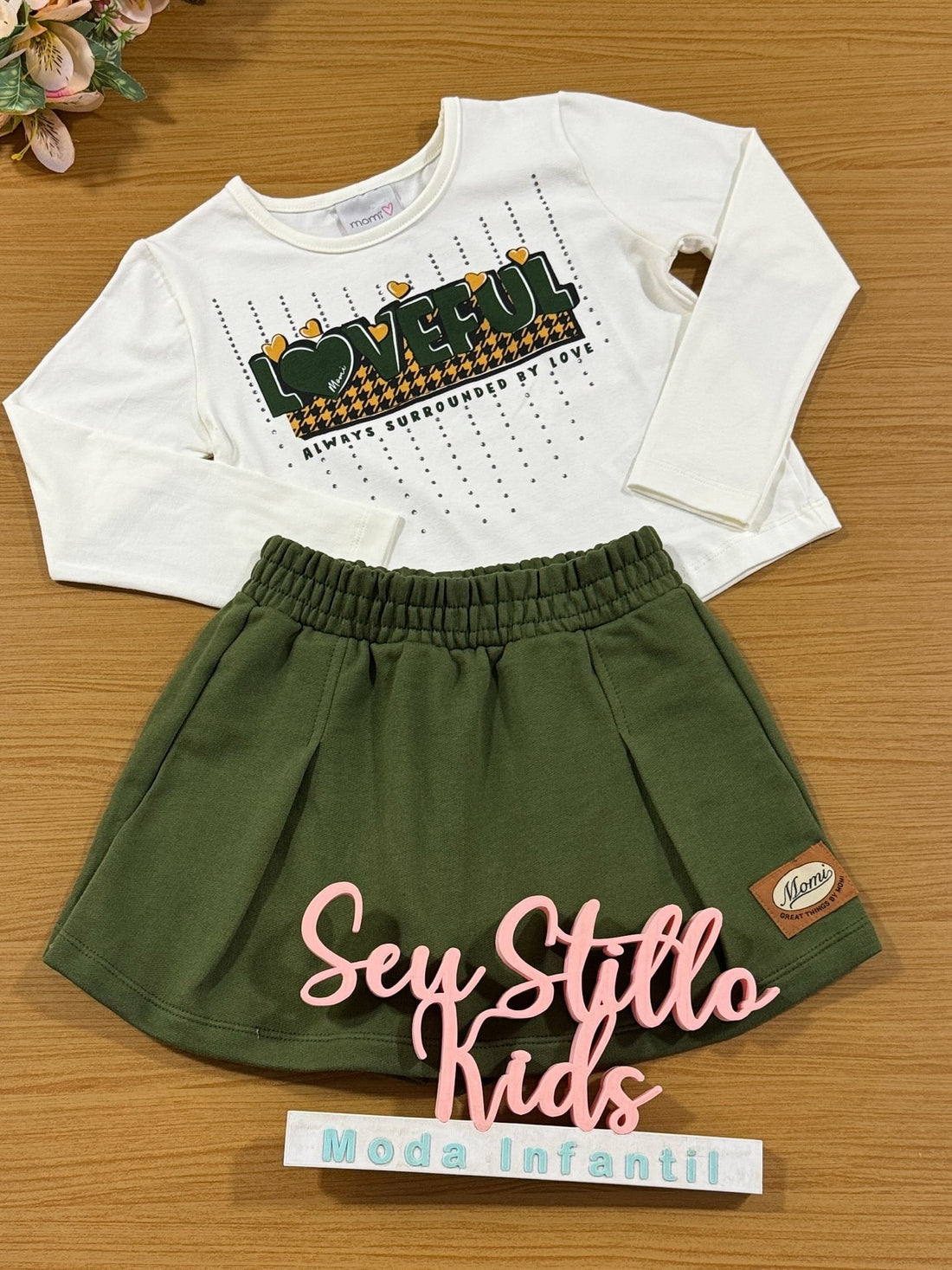 Conjunto Infantil Momi Inverno Shorts Saia Verde e Blusa Love