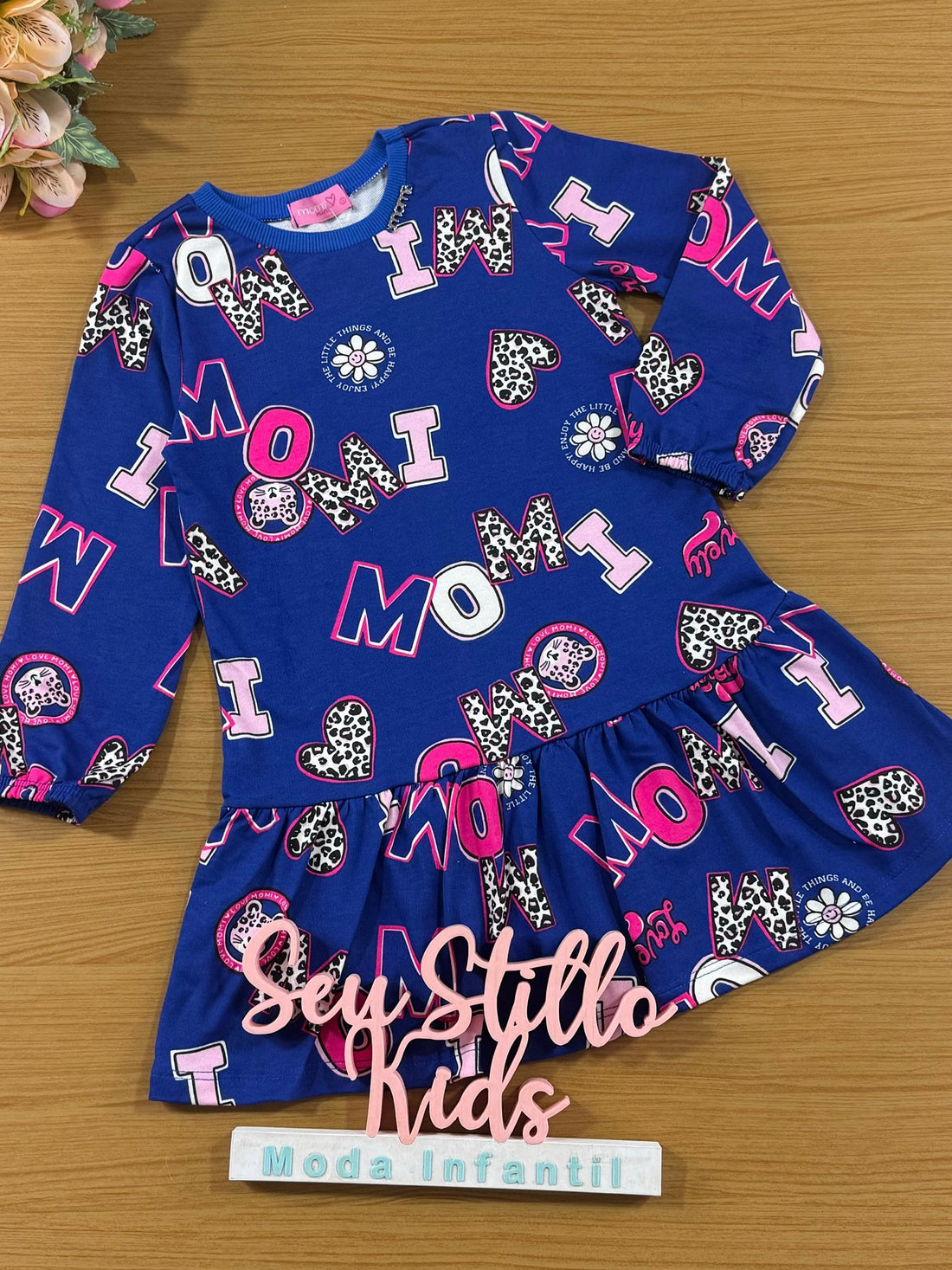 Vestido Infantil Momi Inverno Azul Letras Com Oncinhas