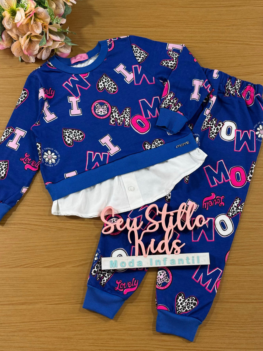 Conjunto Infantil Momi Inverno Calça Azul e Moletom Sem Flanela Letras Oncinha