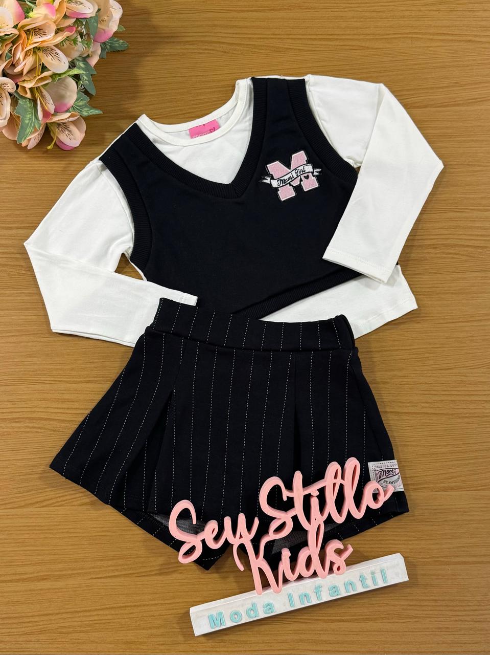 Conjunto Infantil Momi Inverno Short Saia Preto Pontilhado e Blusa Colete Fake