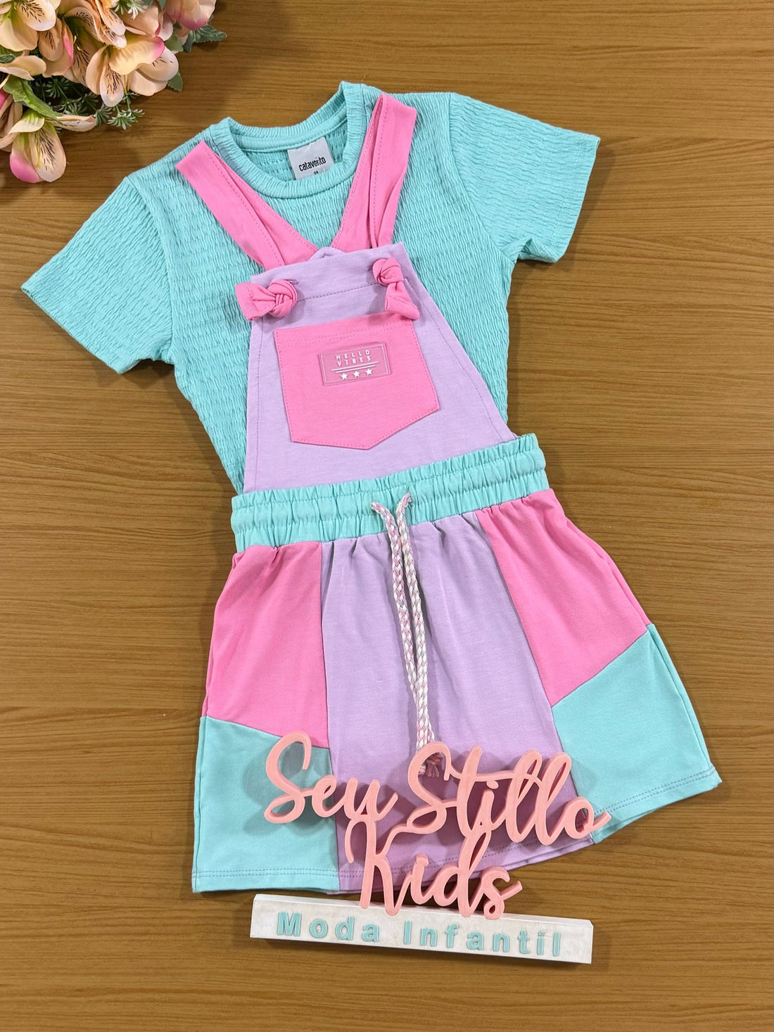 Salopete Infantil Kukie Verão Verde Arco Íris com Blusa