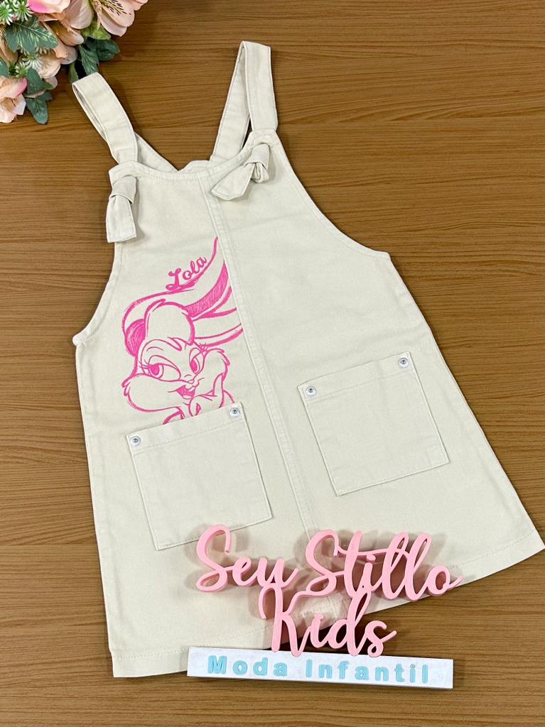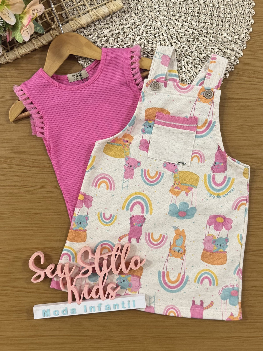 Salopete Infantil Kukiê Verão Off White Bichinhos com Blusa Rosa