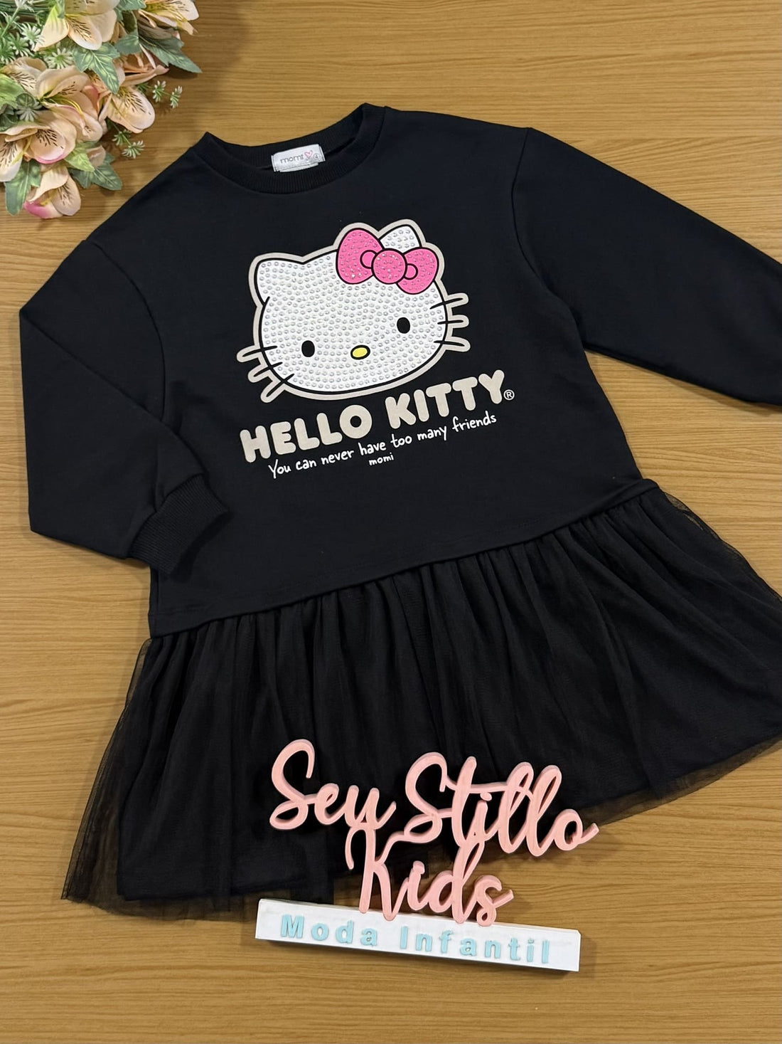 Vestido Infantil Momi Inverno Manga Longa Preto Hello Kitty Strass