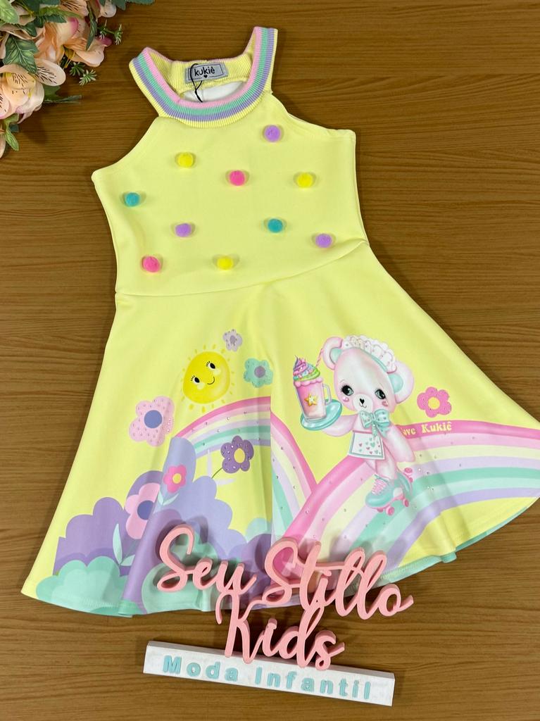 Vestido Infantil Kukie Verão Amarelo Ursinha Doce