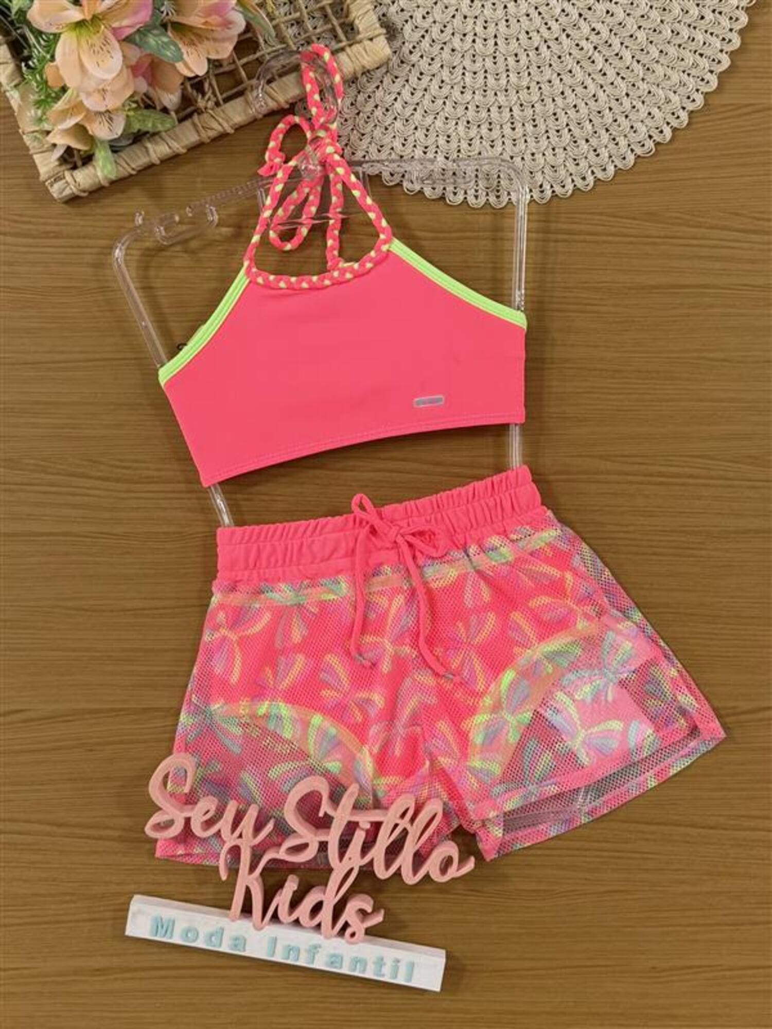 Biquíni Infantil Kukiê Verão Rosa com Saída de Praia em Tule Borboleta