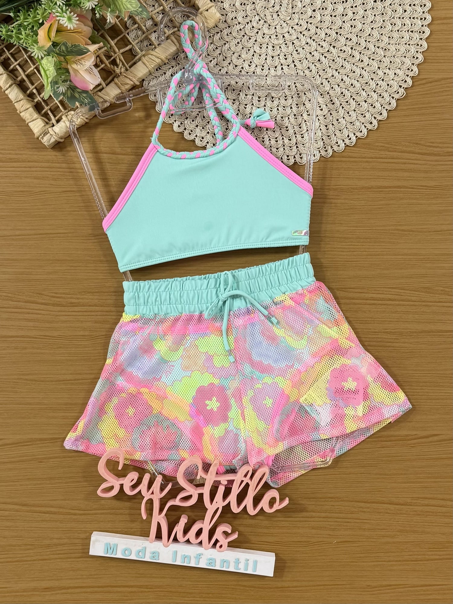 Biquíni Infantil Kukiê Verão Azul com Shorts em Tela Colorido