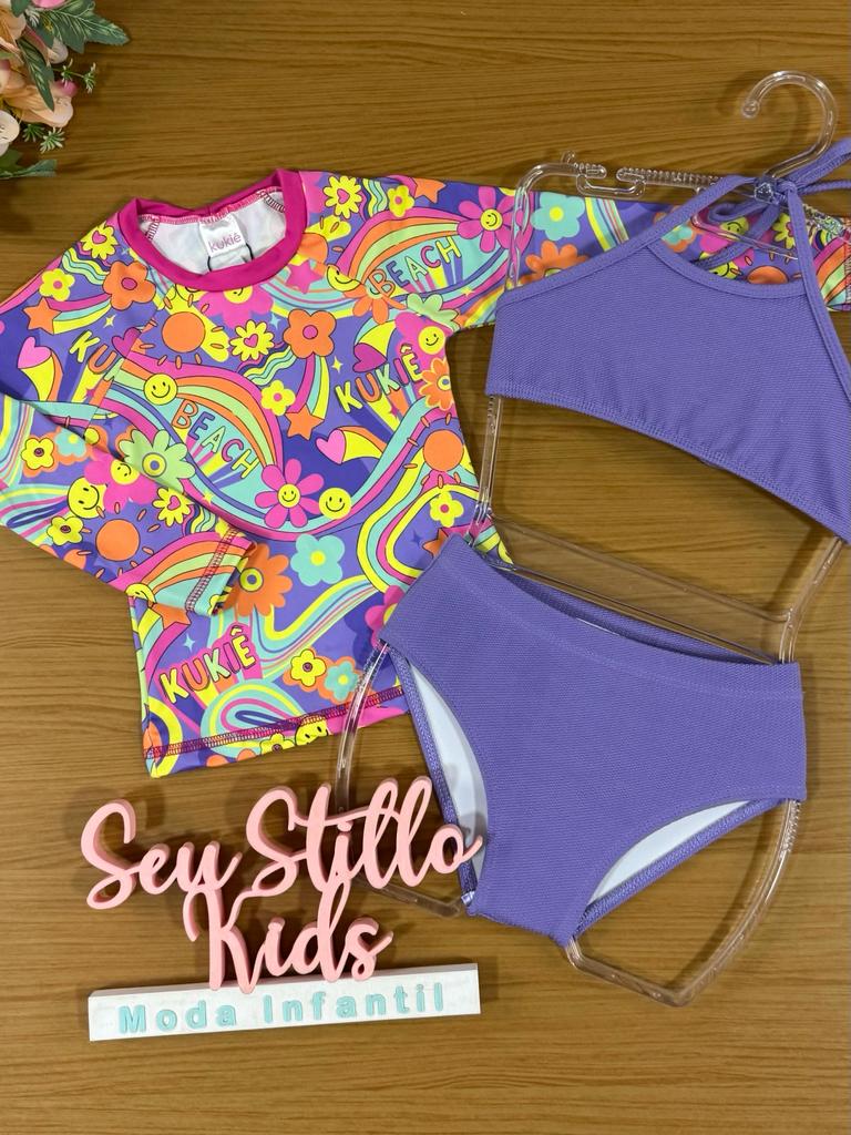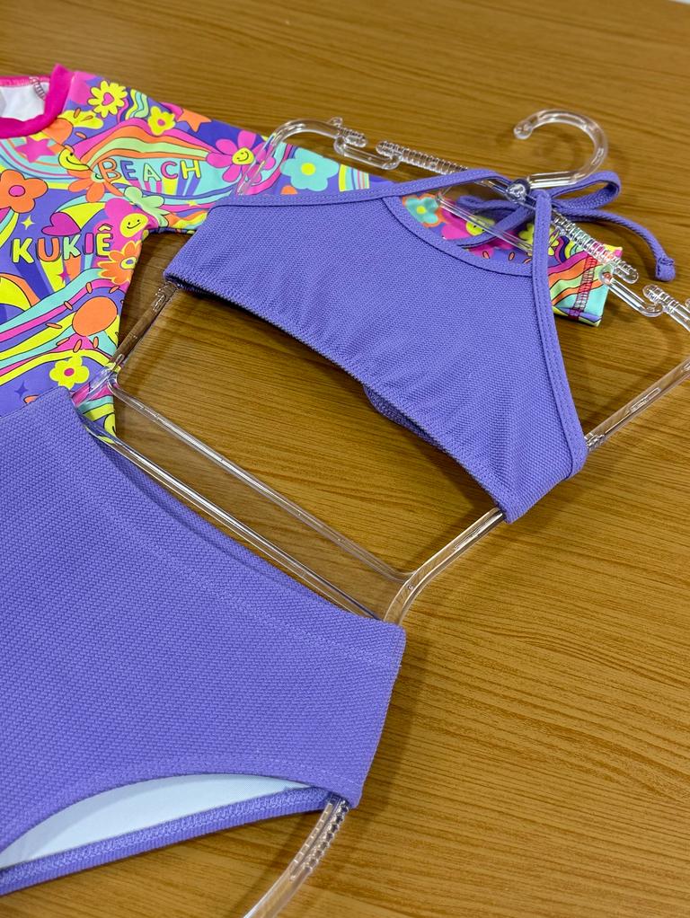 Biquíni Infantil Kukie Verão Com Blusa Manga Longa e Top Lilás