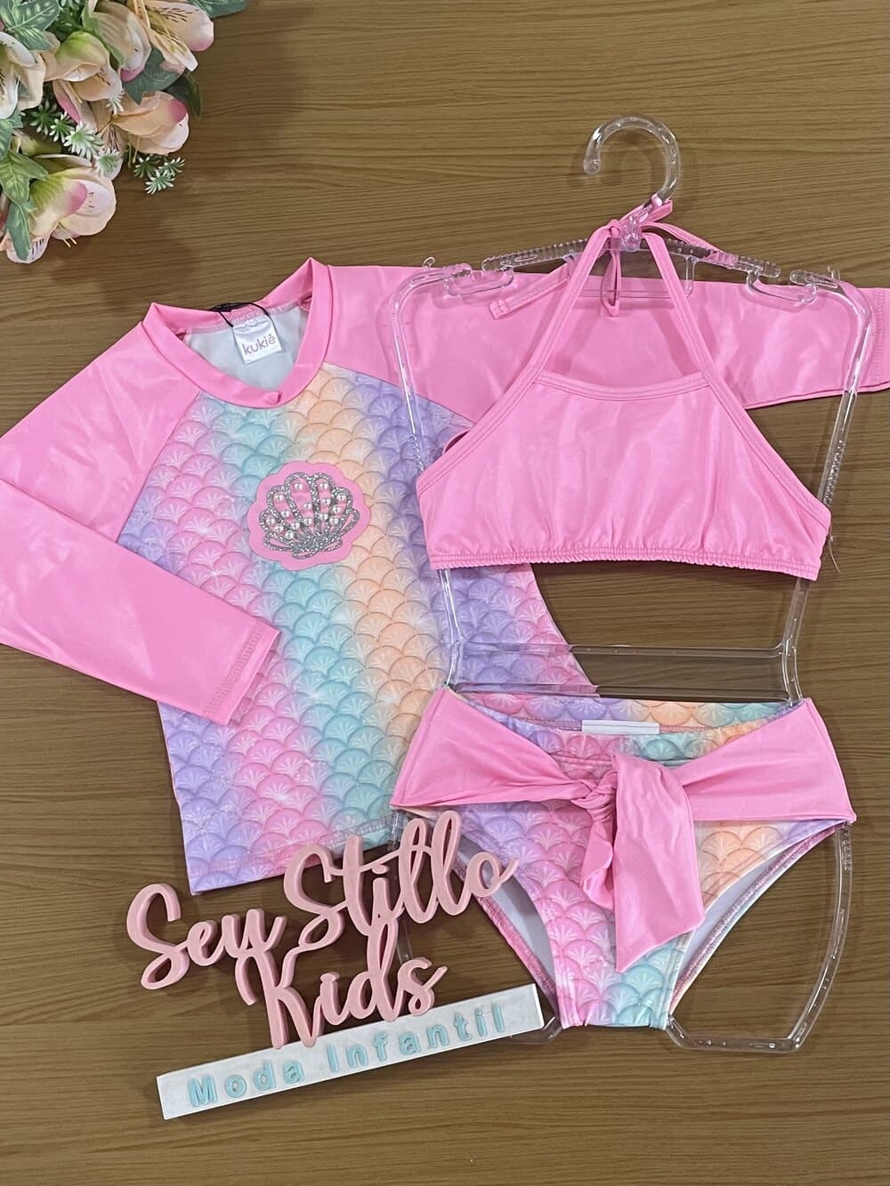 Biquíni Infantil Kukie Verão Com Blusa Manga Longa Rosa Sereia