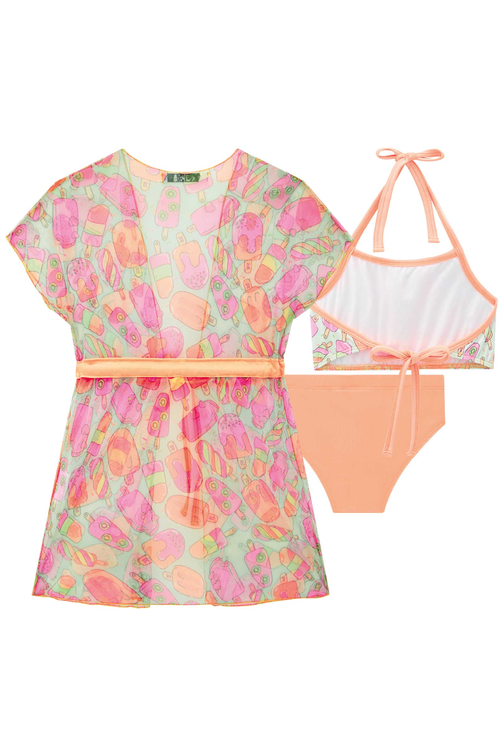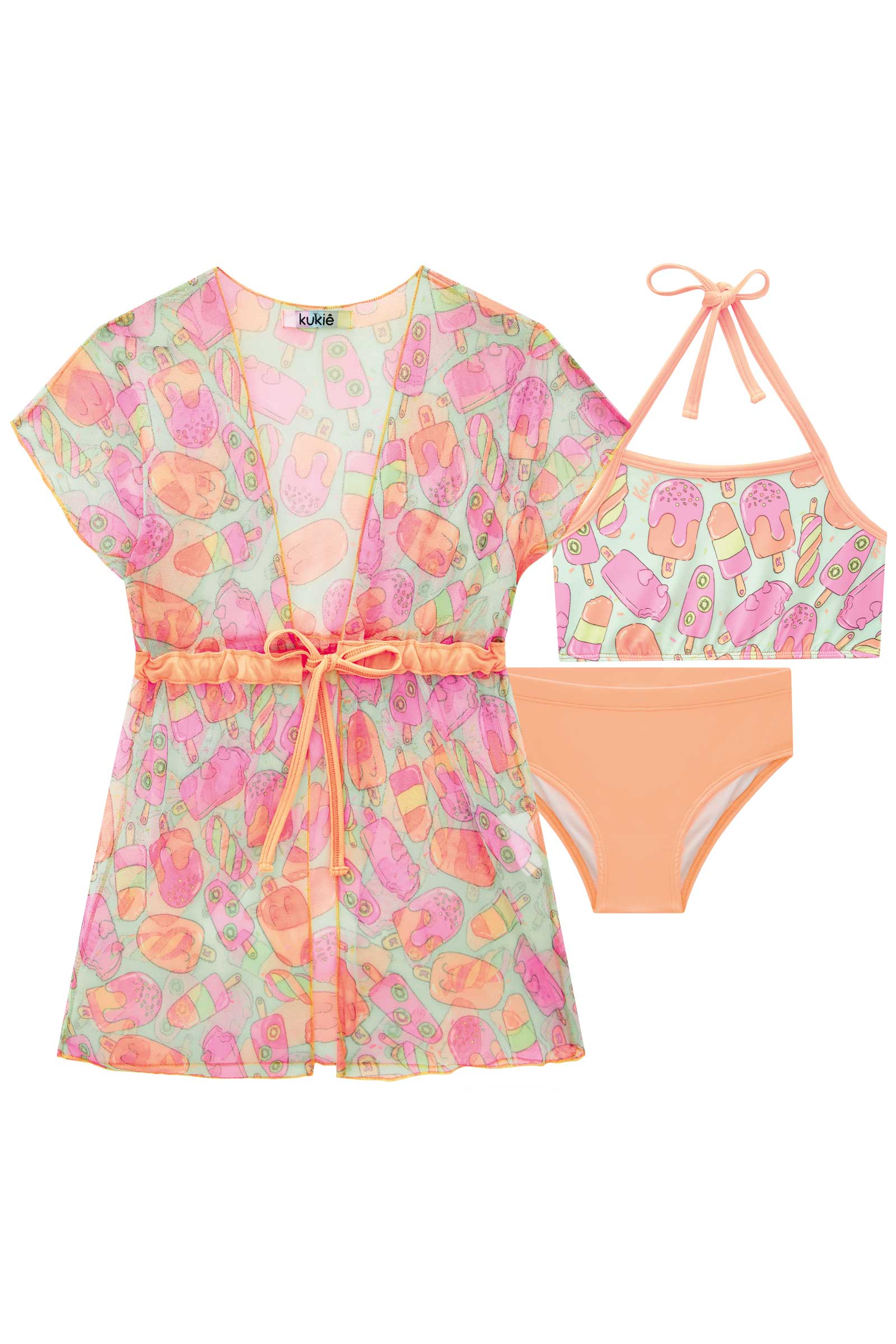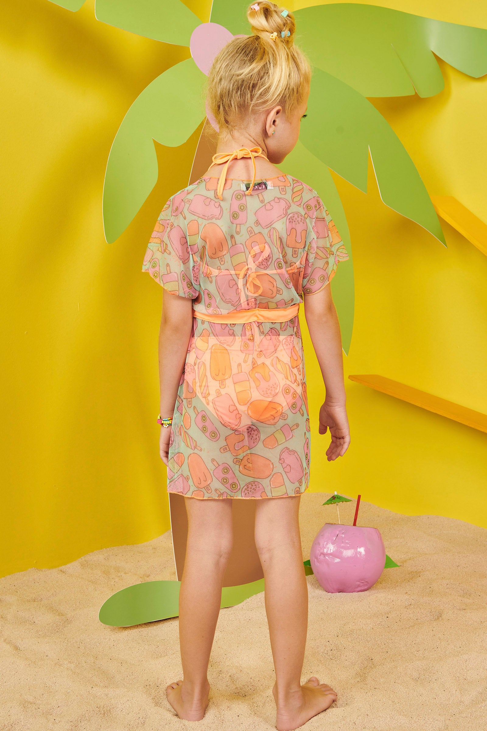 Biquíni Infantil Kukie Verão Com Saída Praia e Piscina Tule Picolé Neon