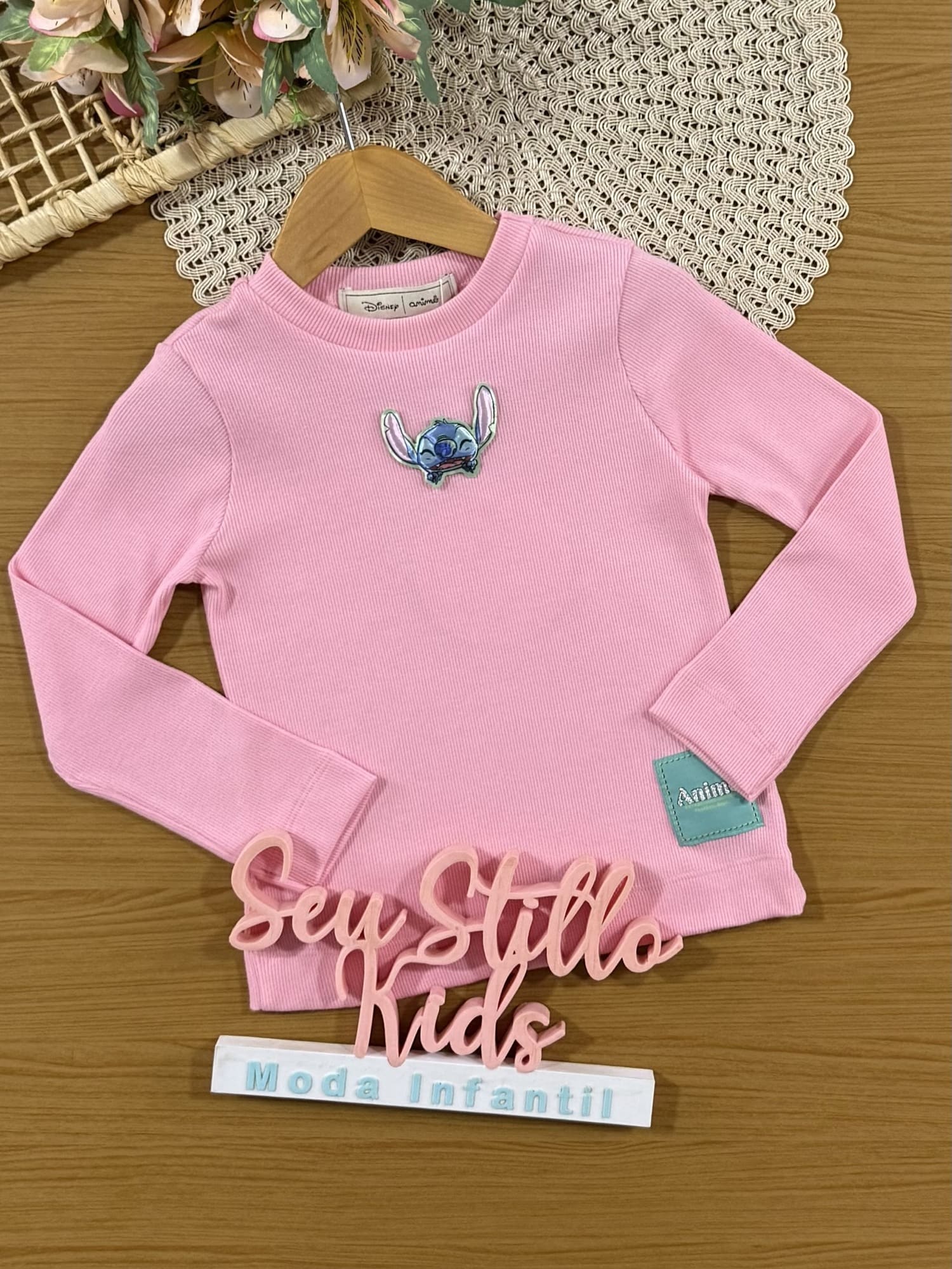 Blusa Infantil Animê Inverno Manga Longa Rosa Stitch Disney