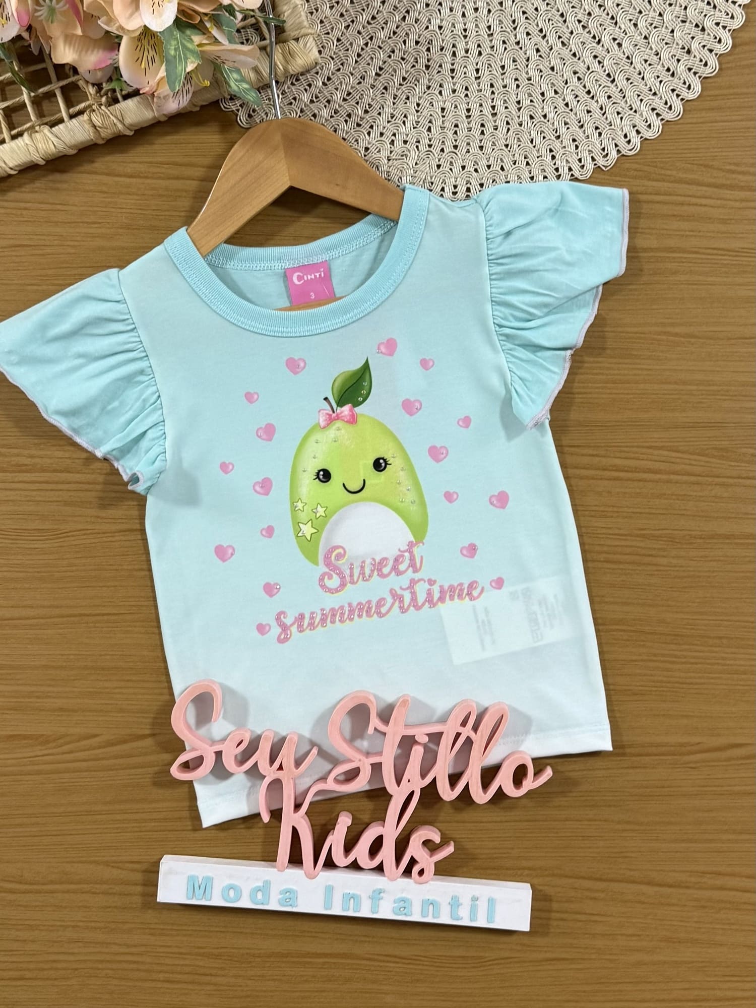 Blusa Infantil Cinti Verão Azul Pera com Strass