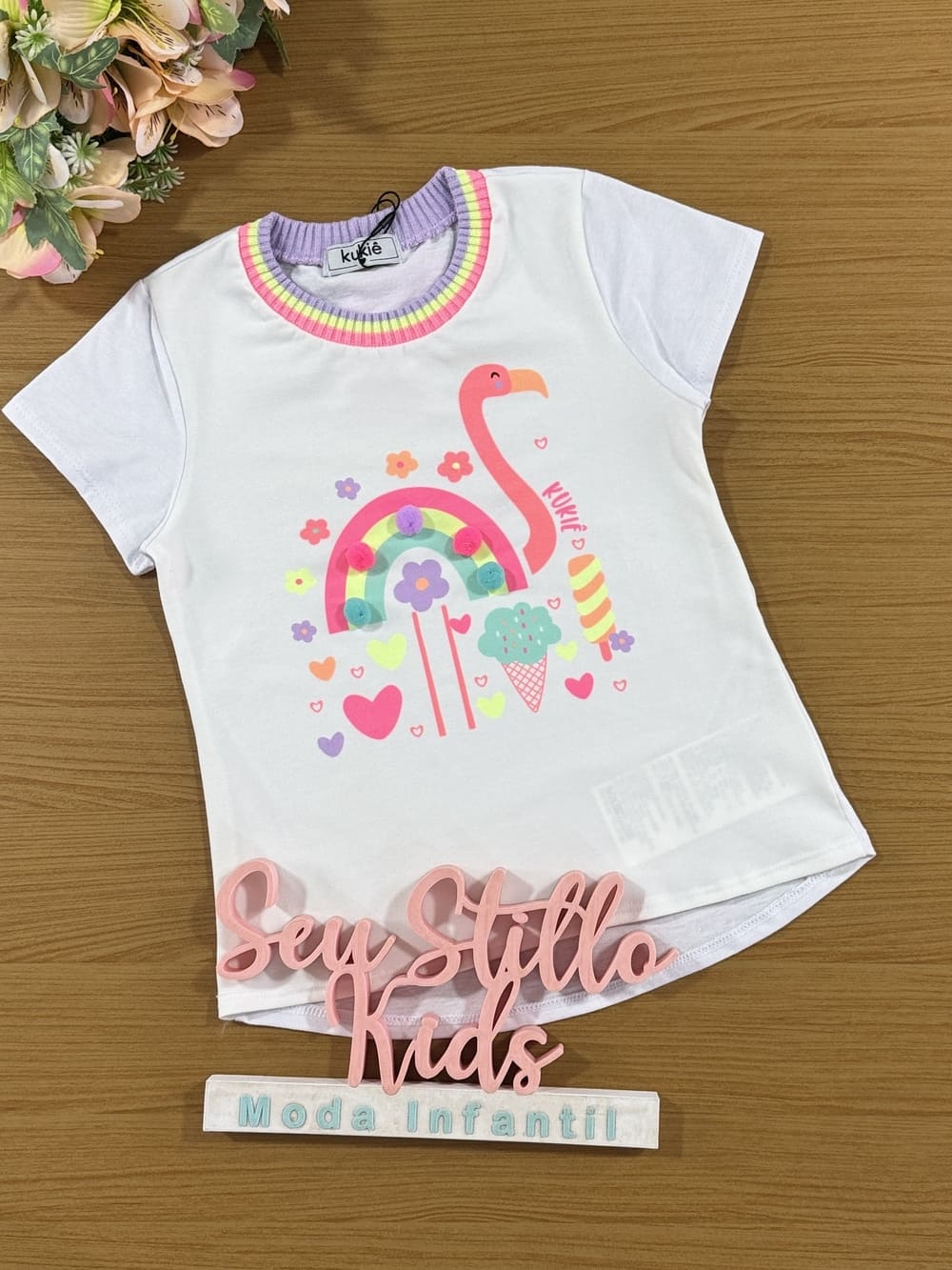 Blusa Infantil Kukie Verão Branca Flamingo Arco Iris