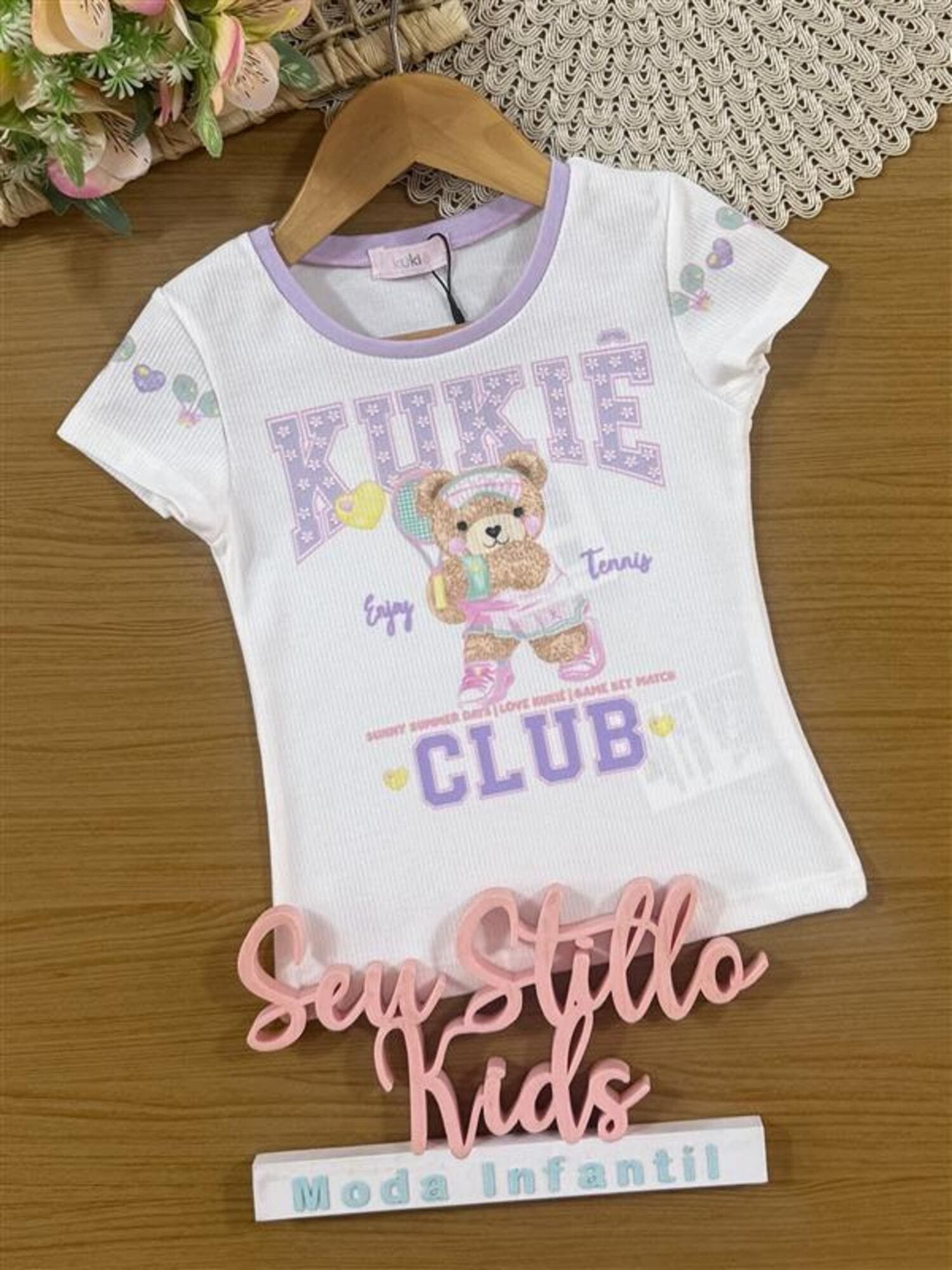 Blusa Infantil Kukiê Verão Off White Ursinha Tênista