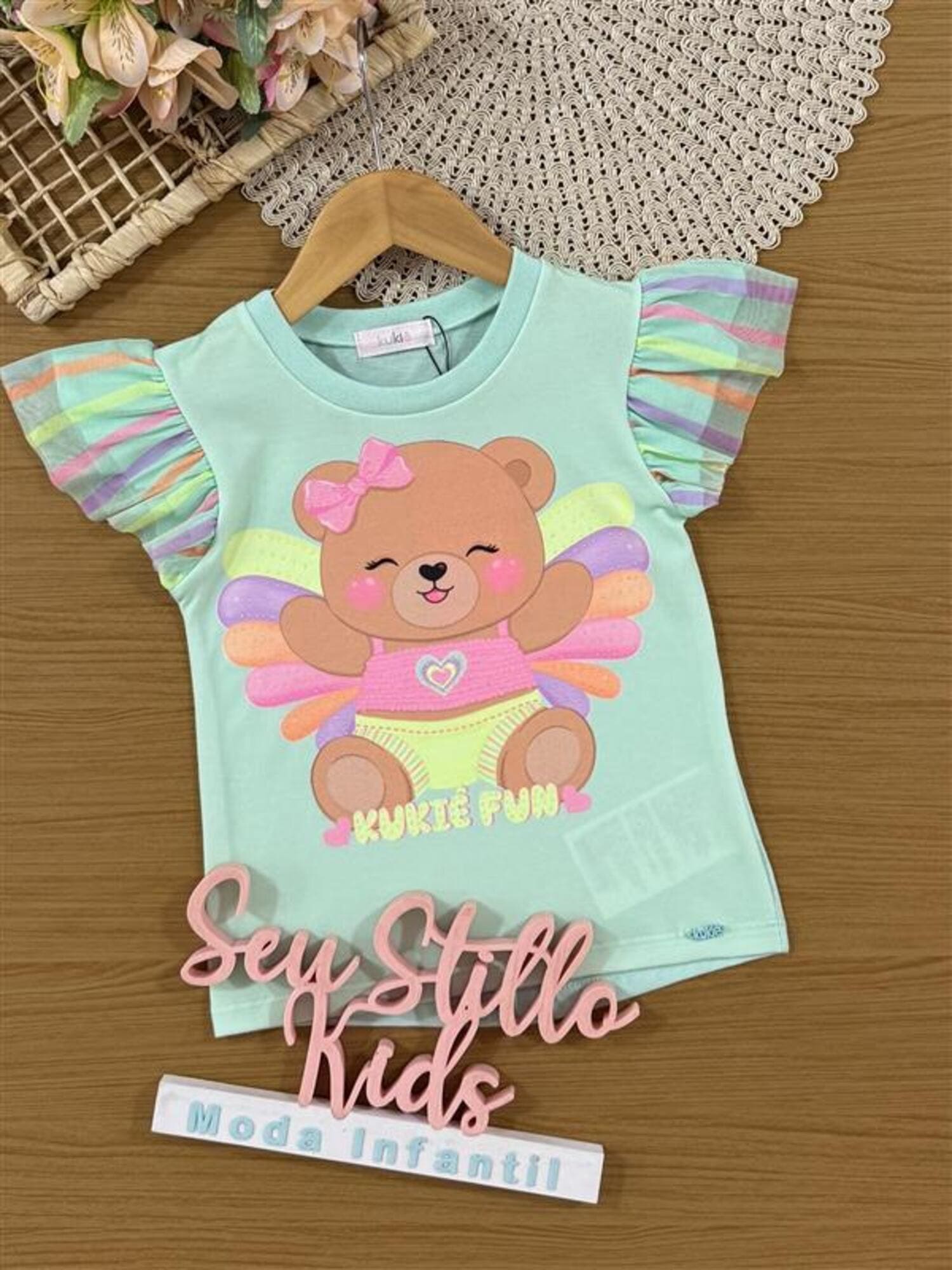 Blusa Infantil Kukiê Verão Verde Ursinha Arco-íris com Strass