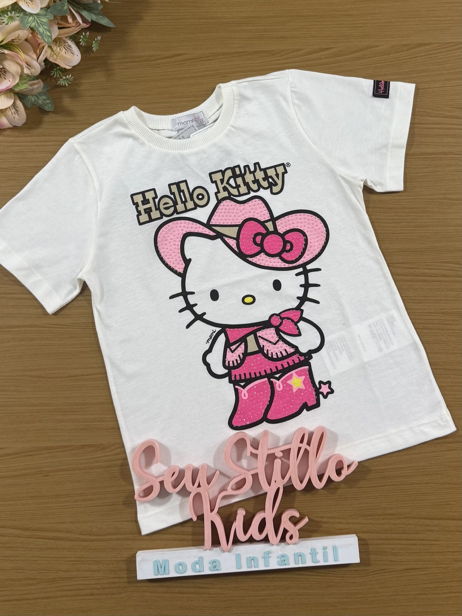 Blusa Infantil Momi Inverno Manga Curta Branco com Strass Hello Kitty