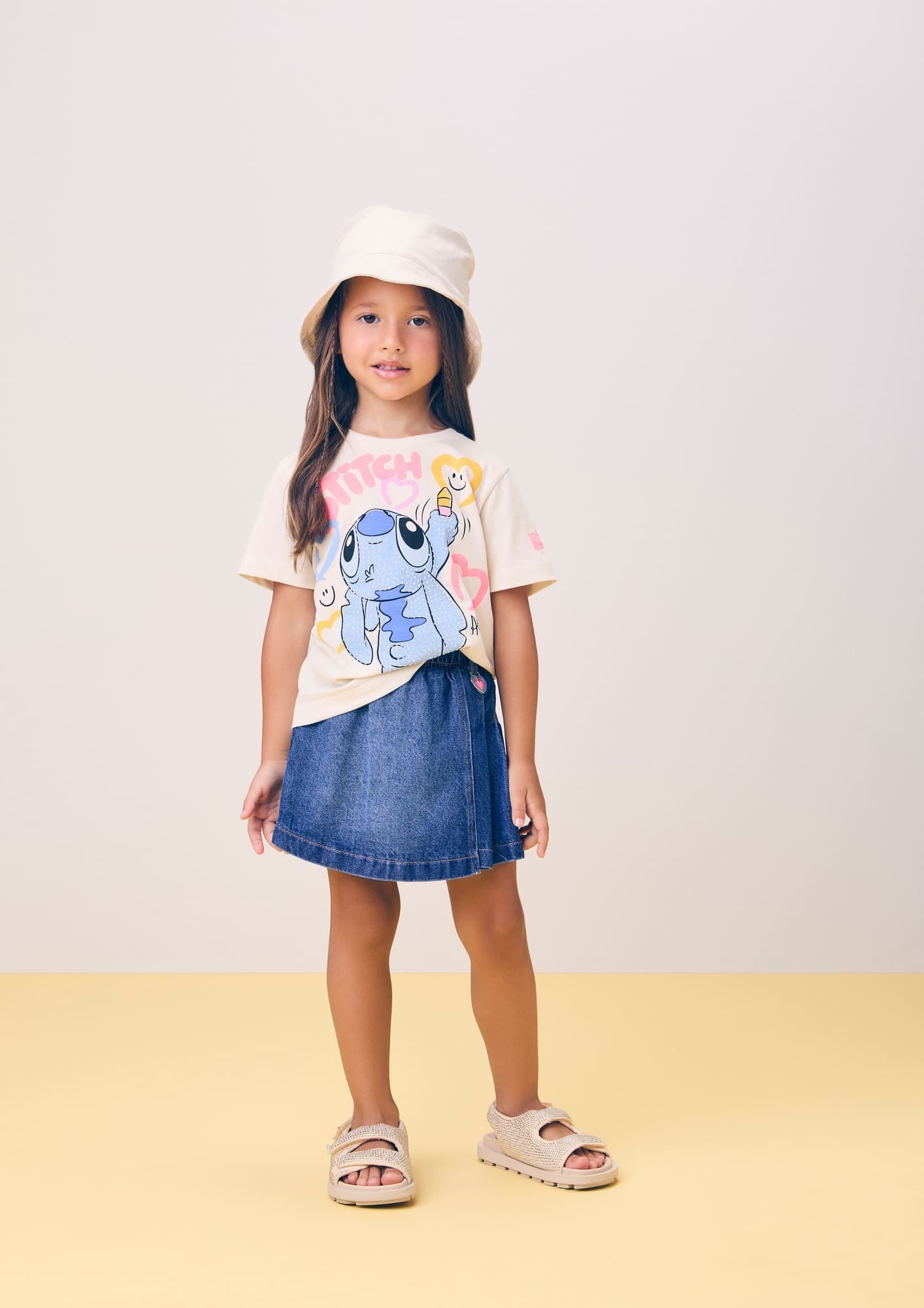 Blusa Infantil Momi Verão Bege Stitch com Strass Disney