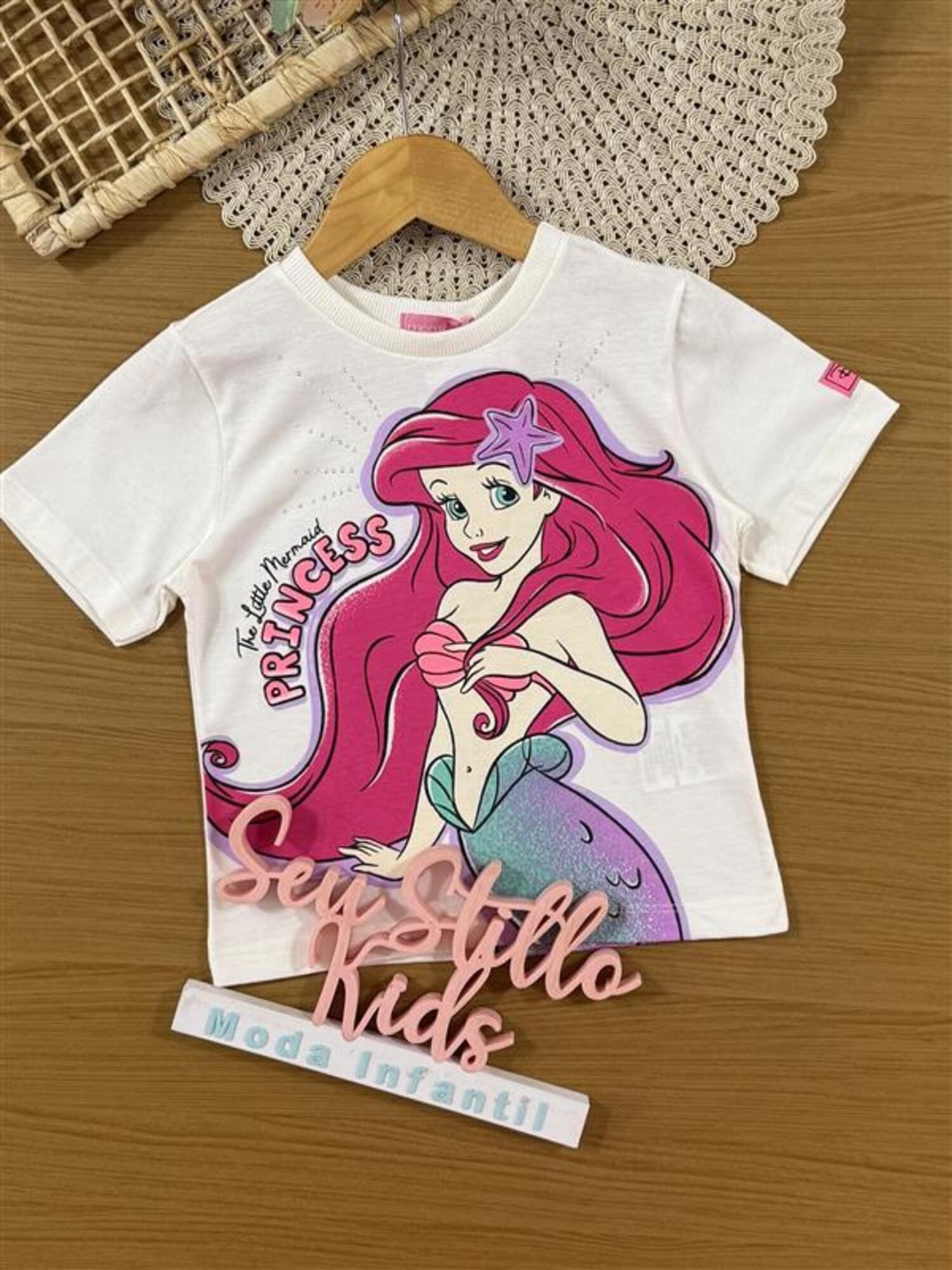 Blusa Infantil Momi Verão Branca Ariel com Strass Disney