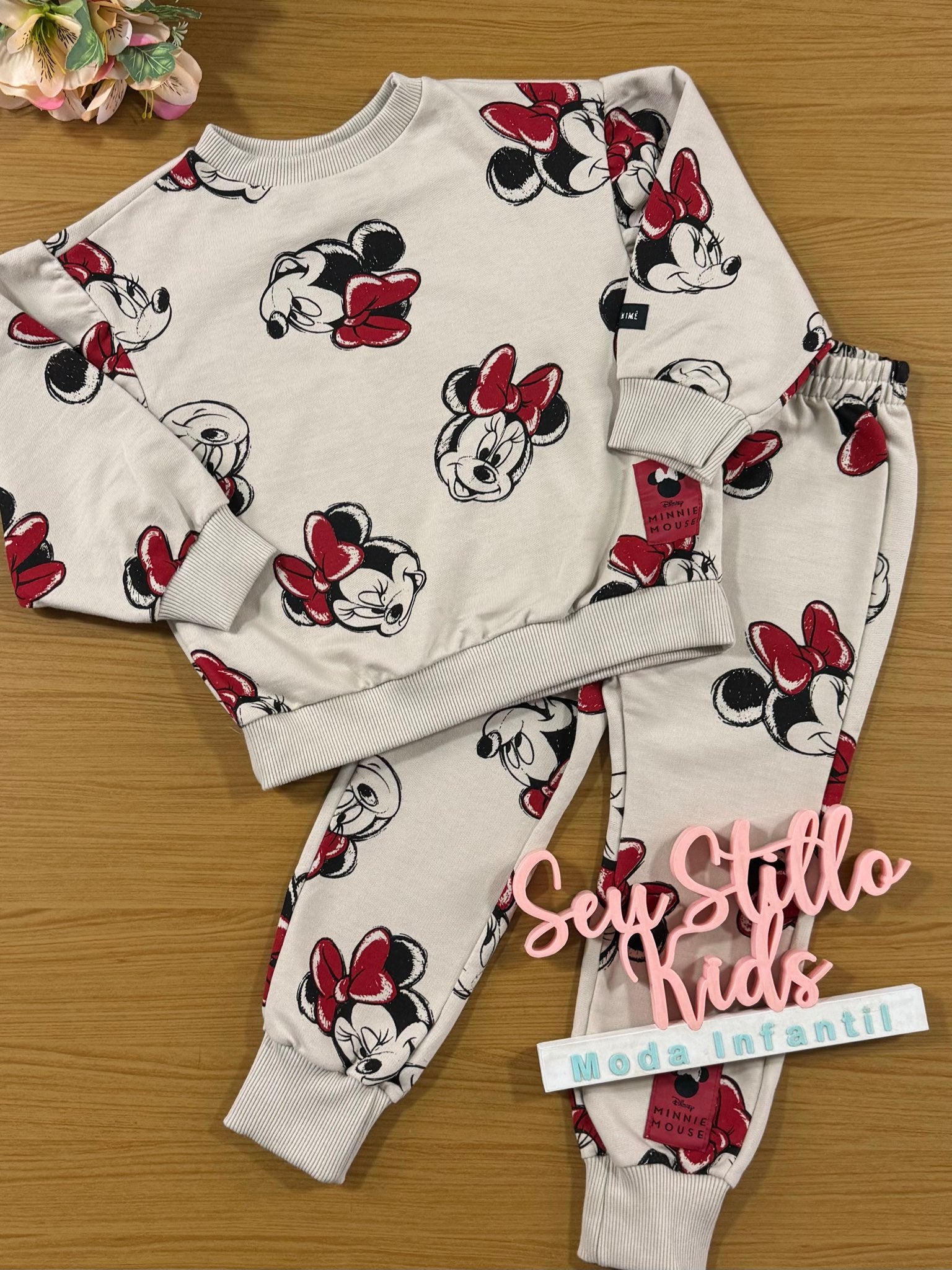 Conjunto Infantil Animê Inverno Calça Bege e Moletom Sem Flanela Minnie Disney