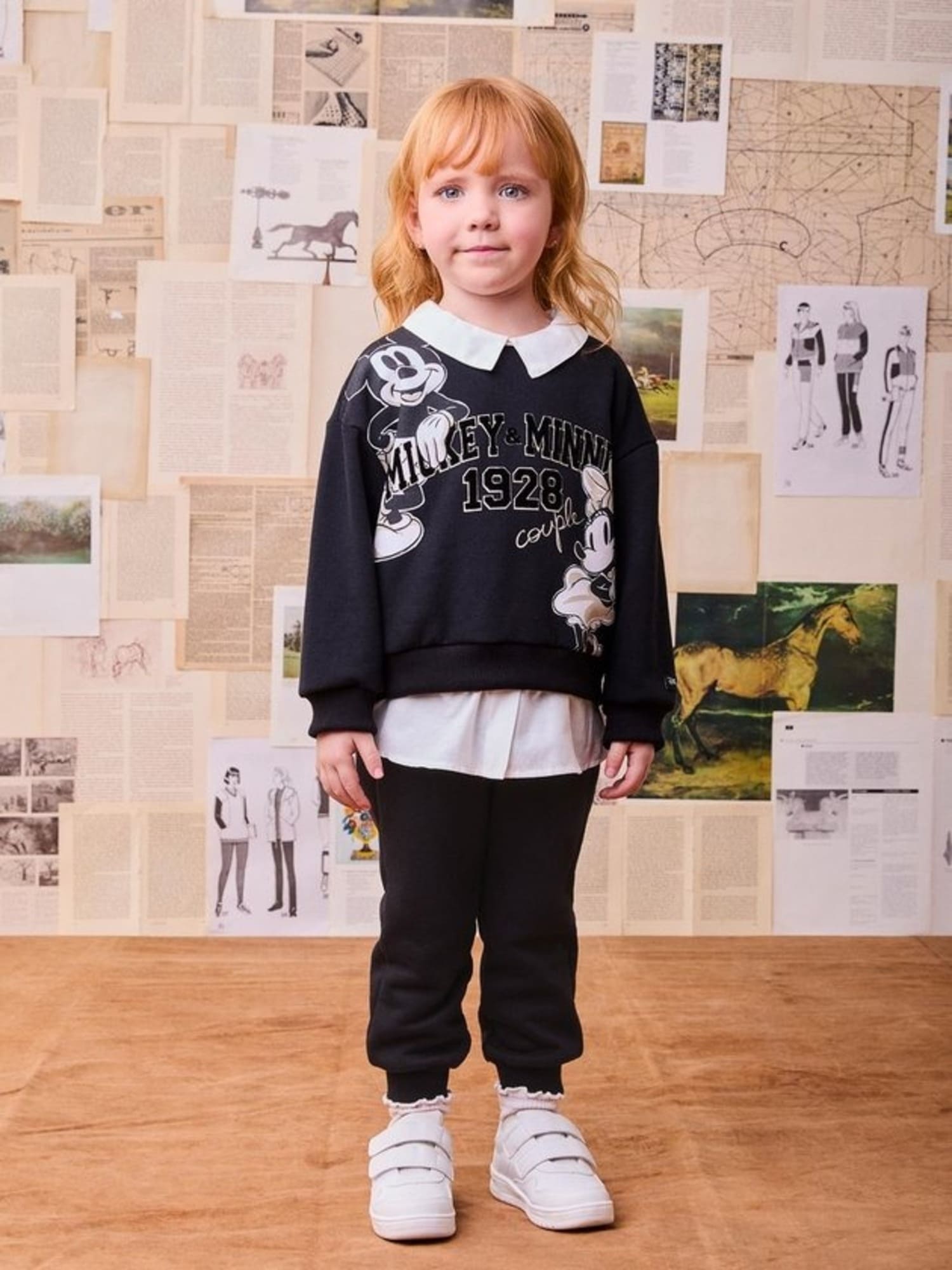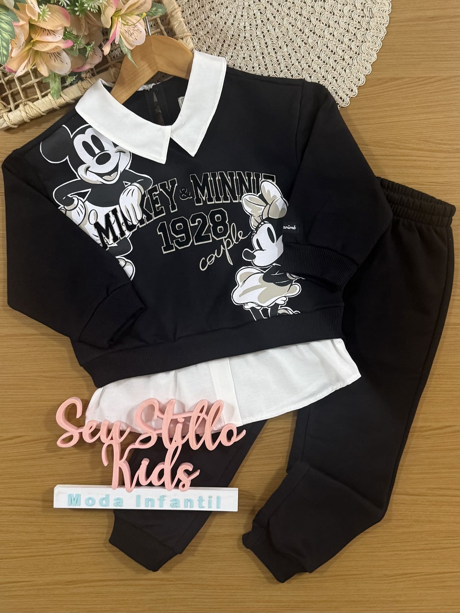 Conjunto Infantil Animê Inverno com Calça e Moletom com Flanela Preto Minnie e Mickey Disney