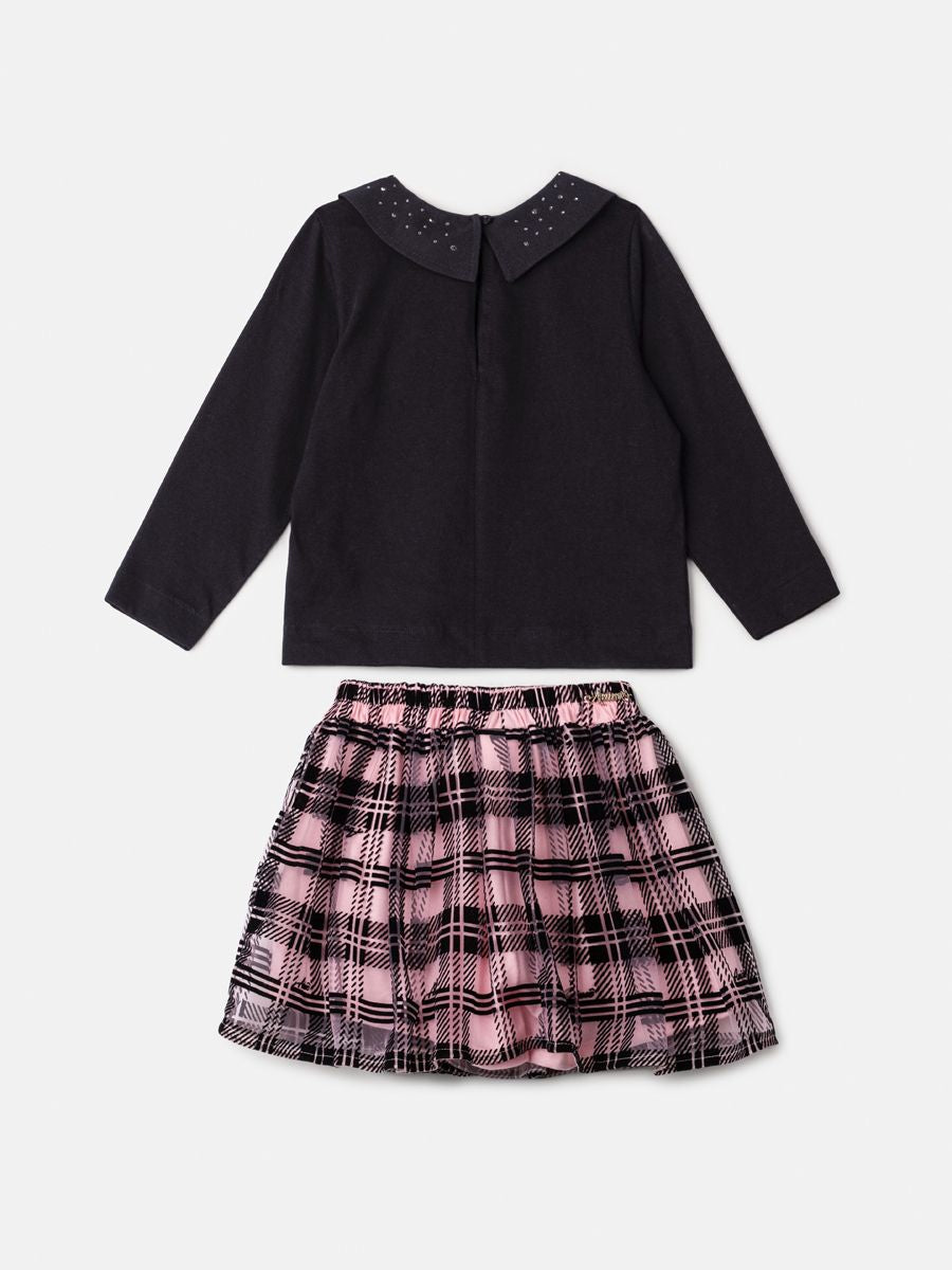 Conjunto Infantil Animê composto por blusa em cotton com gola com detalhes de pontos de strass, abertura de um botão nas costas, mangas longas. Saia com elástico na cintura em tule e camurça toda no xadrez e com shorts embutido.