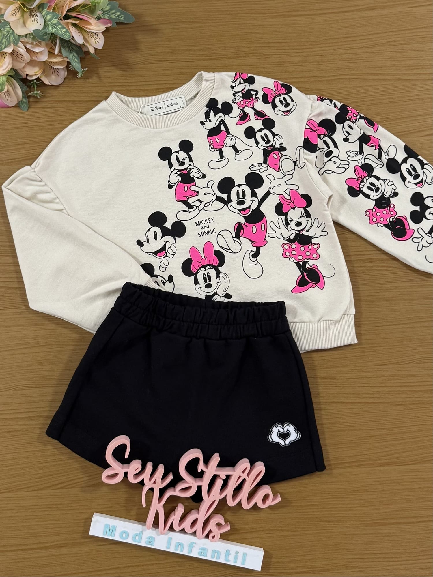 Conjunto Infantil Animê Inverno com Shorts Saia Preta e Casaco Bege Minnie e Mickey Disney