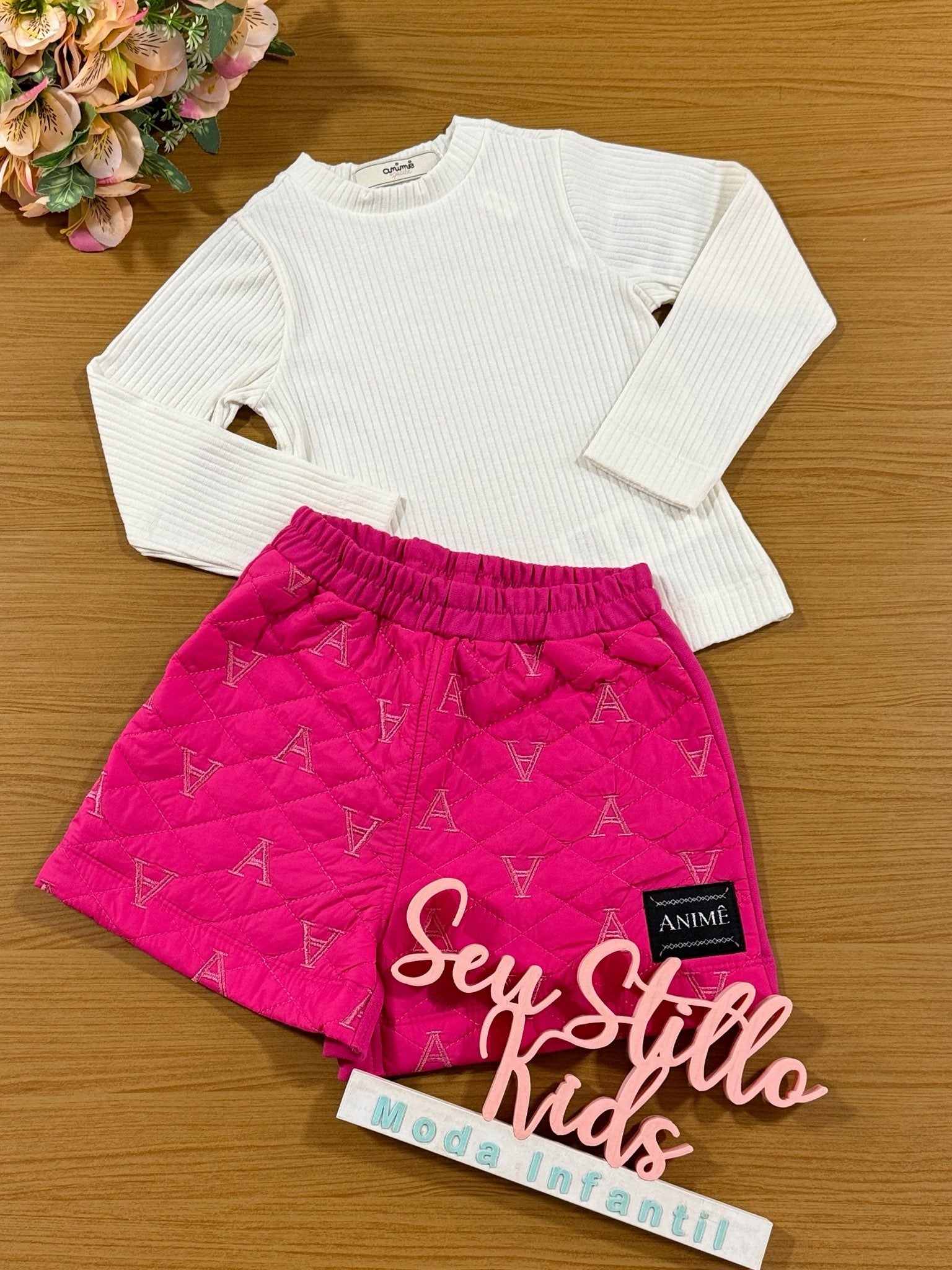 Conjunto Infantil Animê Inverno Shorts e Blusa Manga Longa Branca