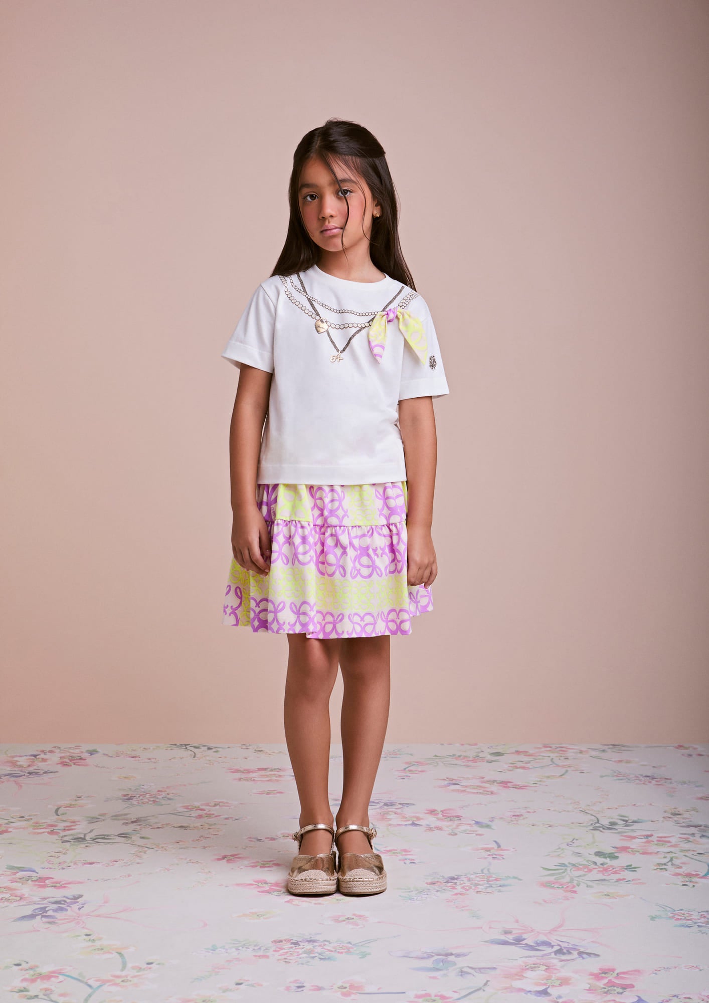 Conjunto Infantil Animê Verão com Saia Bege e Blusa Branca Acessórios com Laço