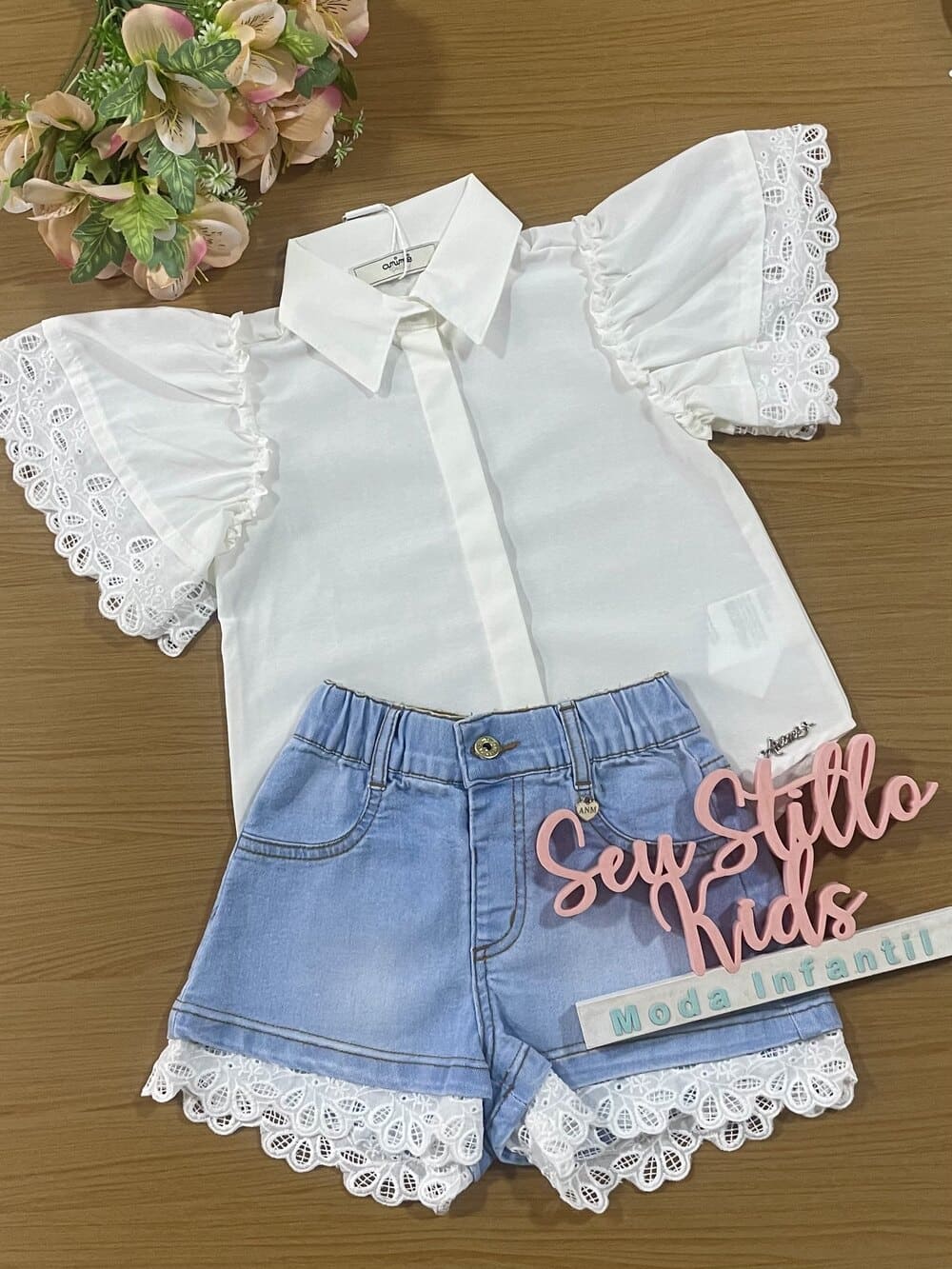 Conjunto Infantil Animê Verão Shorts Jeans e Camisa Branca com Bordado Inglês
