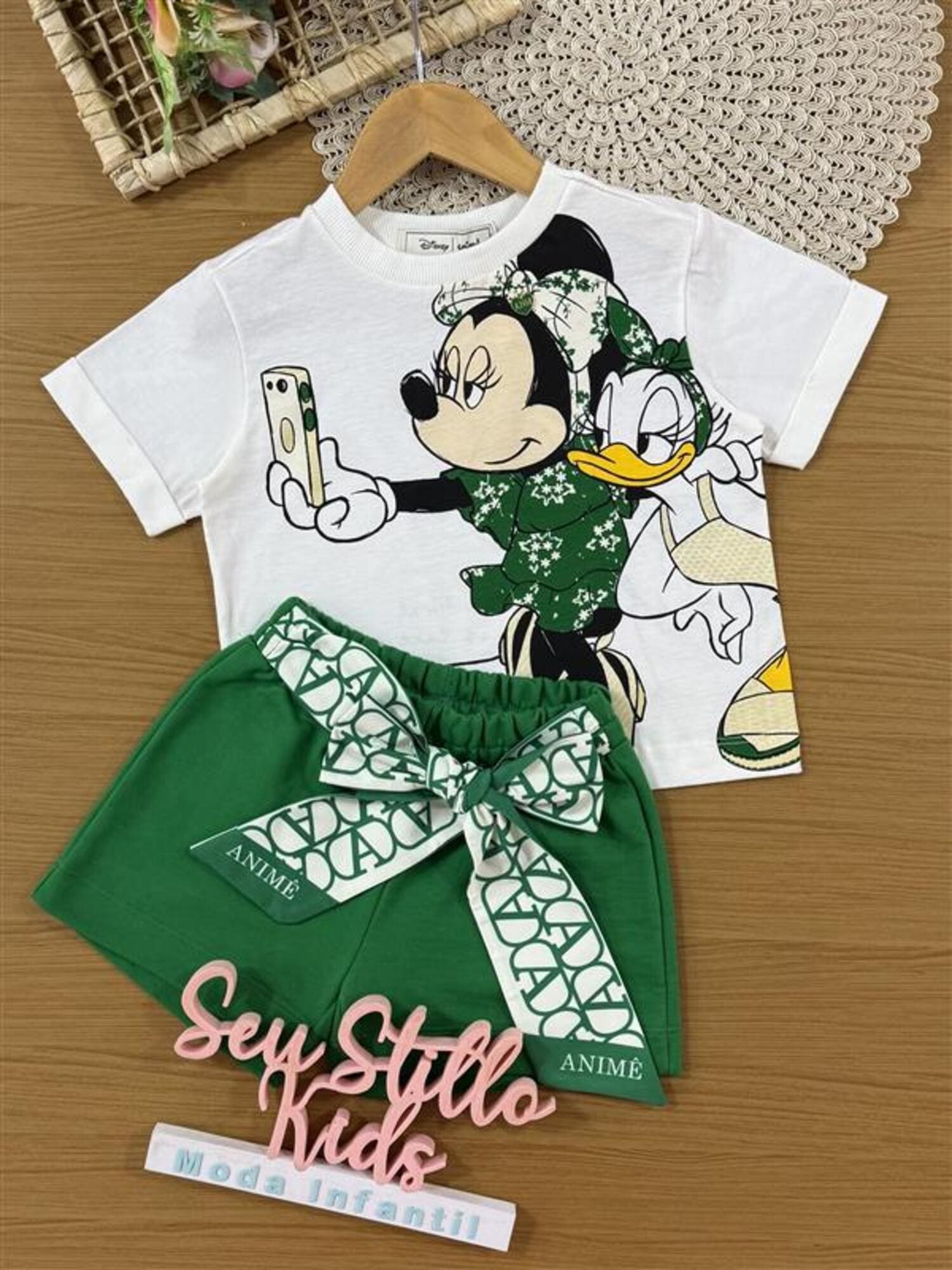 Conjunto Infantil Animê Verão Shorts Verde com Laço e Blusa Branca Minnie e Daisy Disney