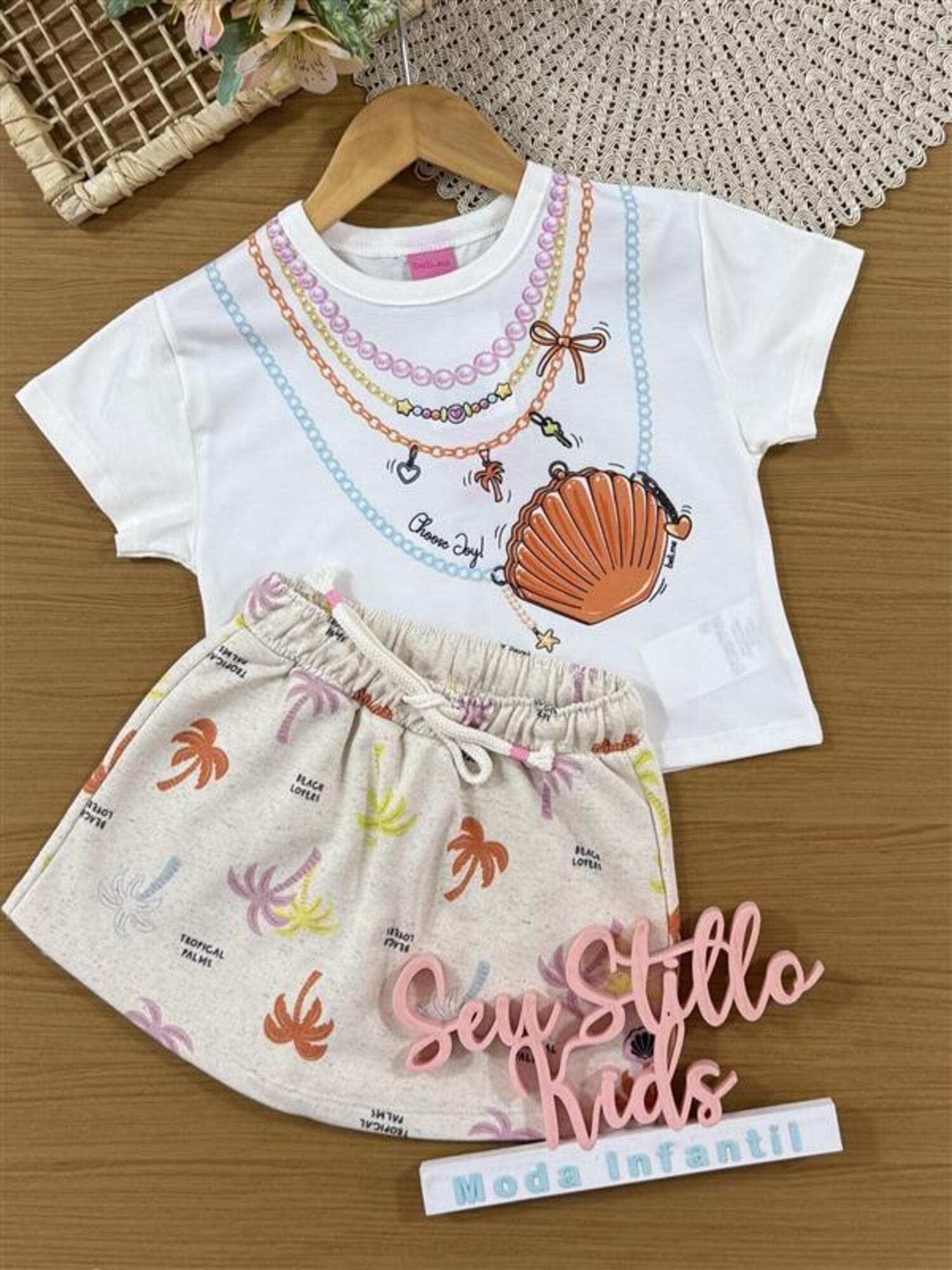 Conjunto Infantil Belime Verão com Shorts Saia Off White e Blusa Branca Acessórios 3D