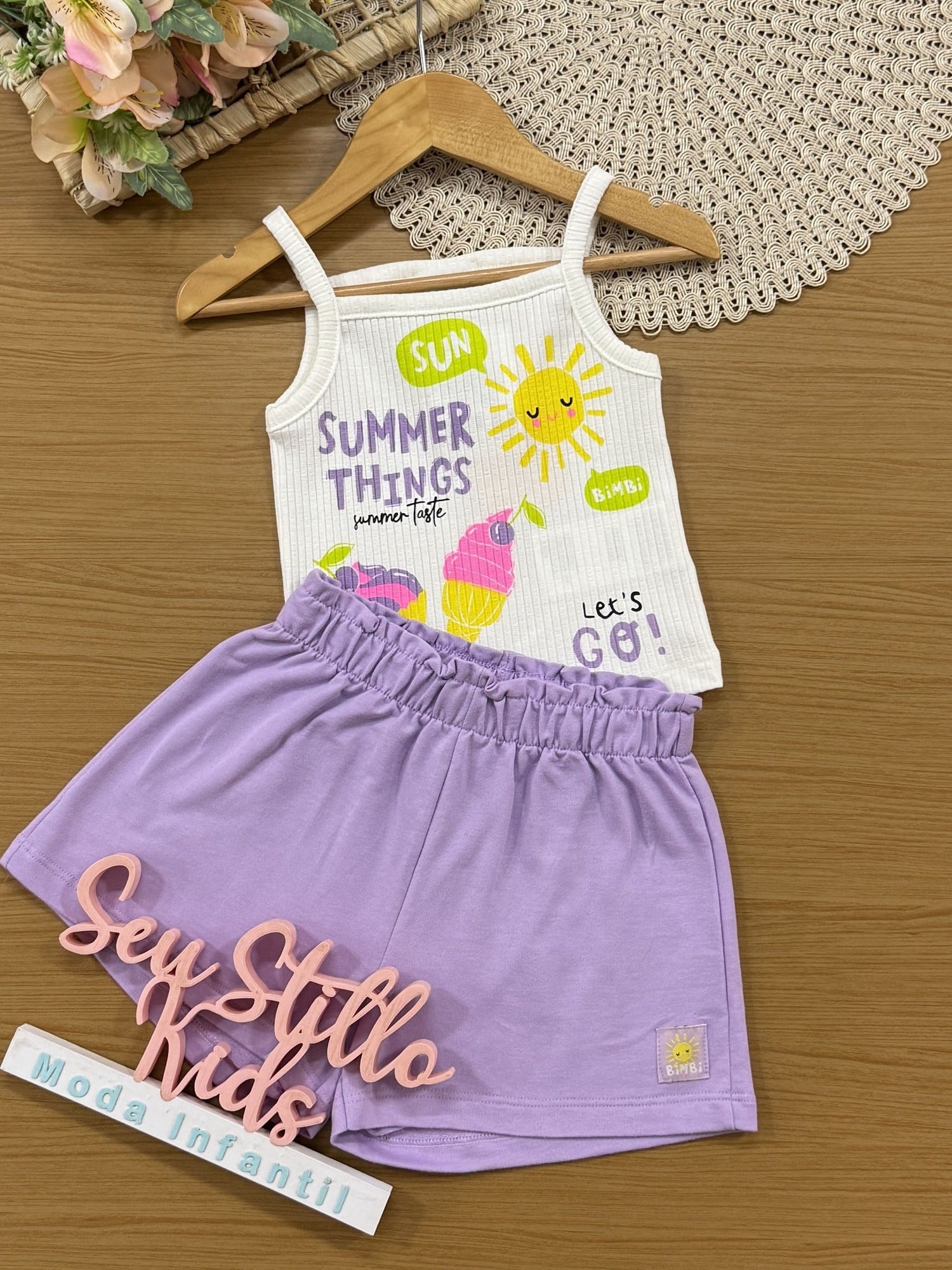 Conjunto Infantil Bimbi Verão com Short Roxo e Blusa Branca Sabor Verão