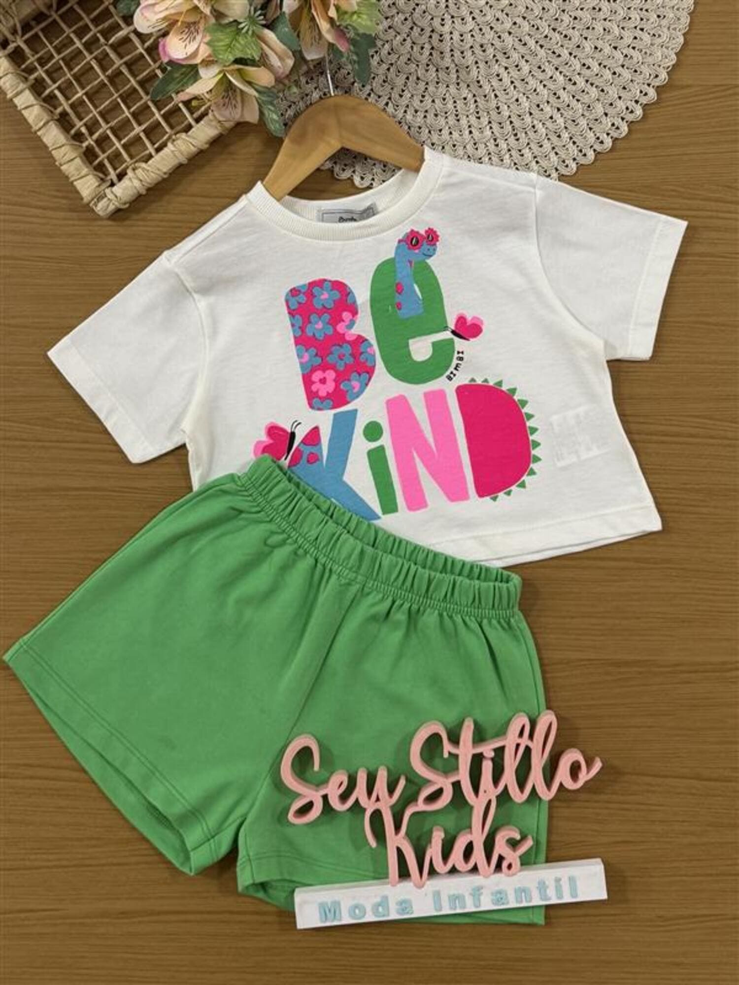 Conjunto Infantil Bimbi Verão com Shorts Verde e Blusa Branca Maçãzinha Be Kind