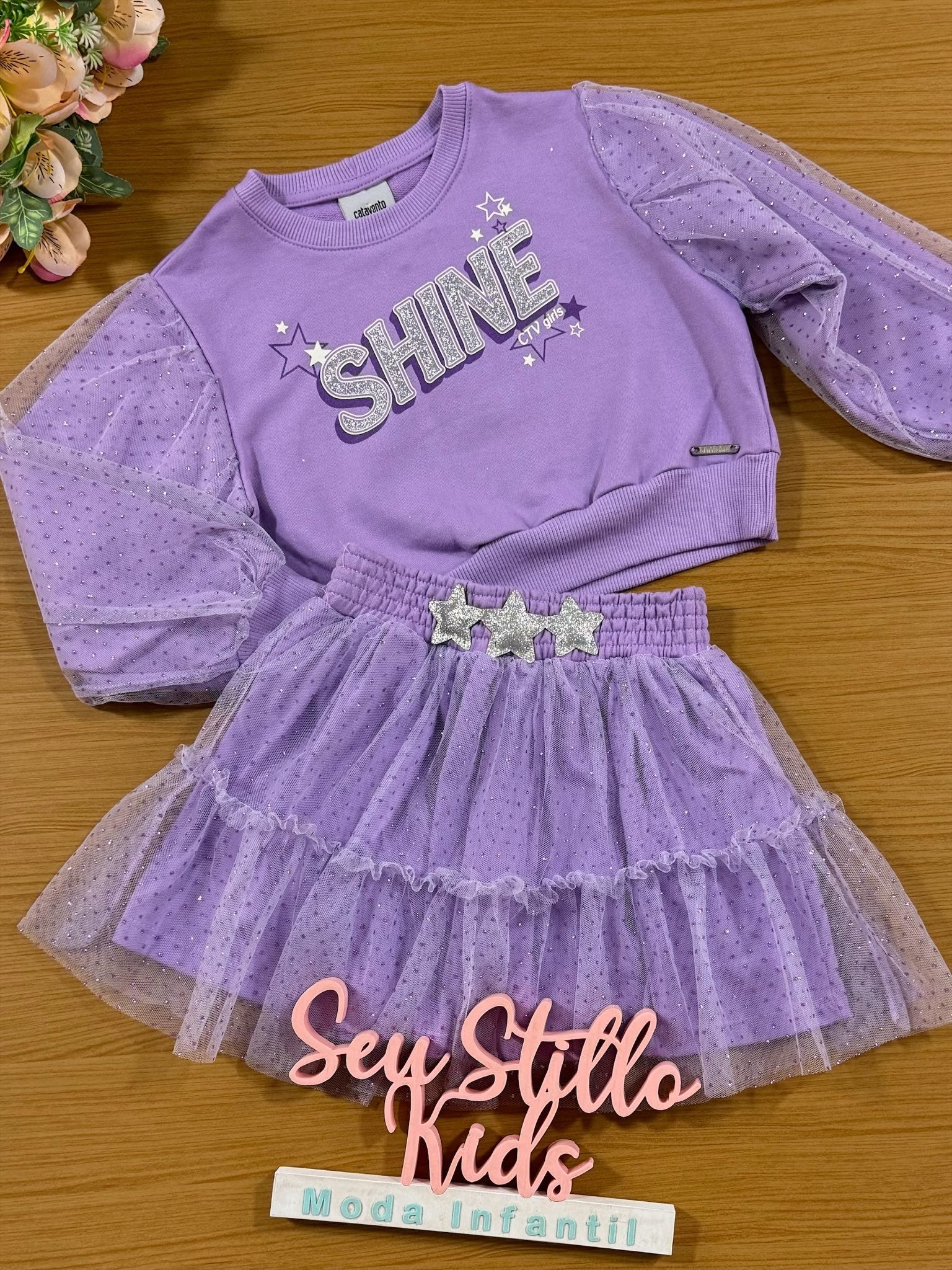 Conjunto Infantil Catavento Inverno Saia Tule e Moletom Lilás Shine