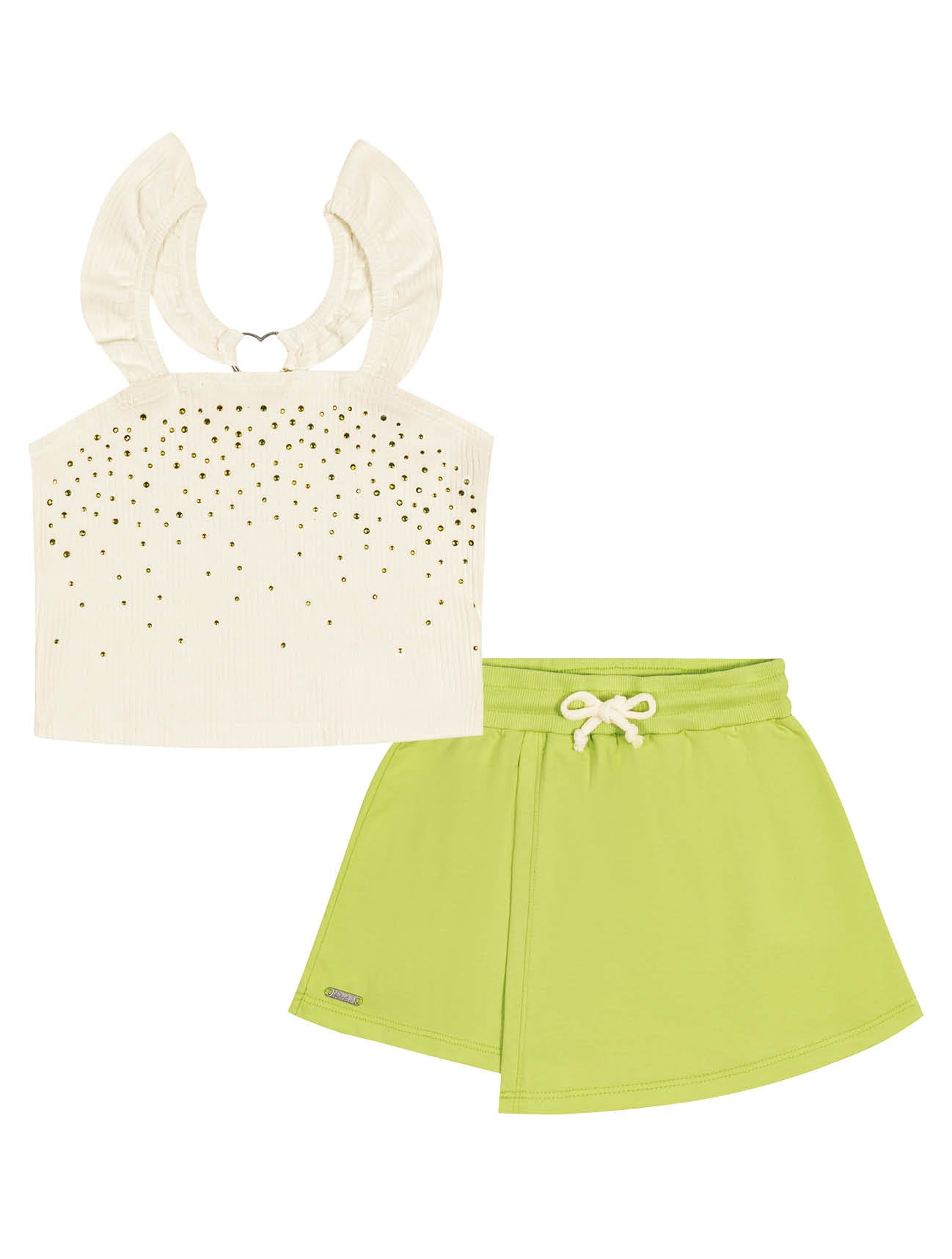 Conjunto Infantil Catavento Verão Shorts Saia Verde e Blusa Brilho