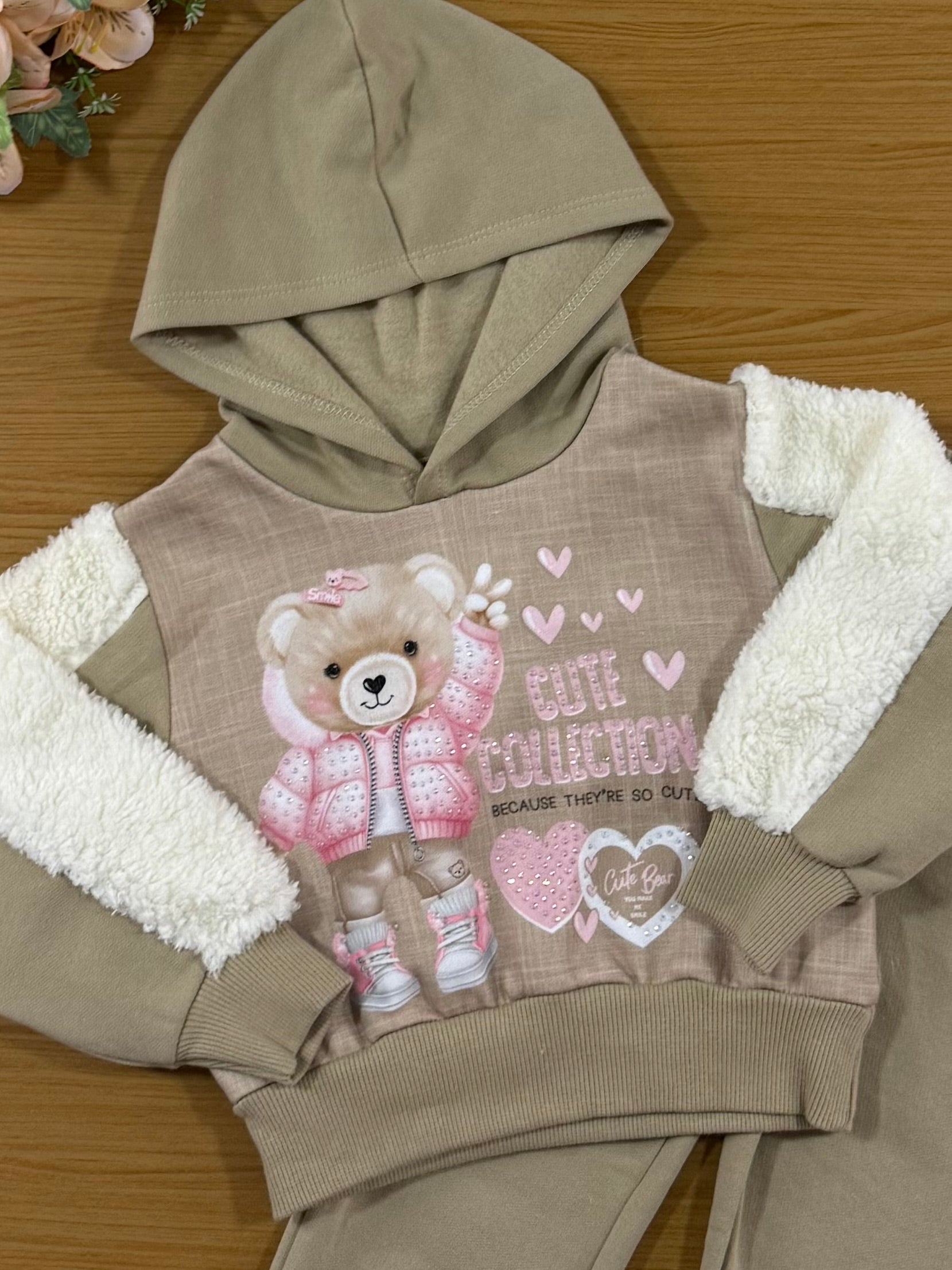 Conjunto Infantil Cinti Inverno Calça e Moletom Flanelado Bege Ursinha com Strass