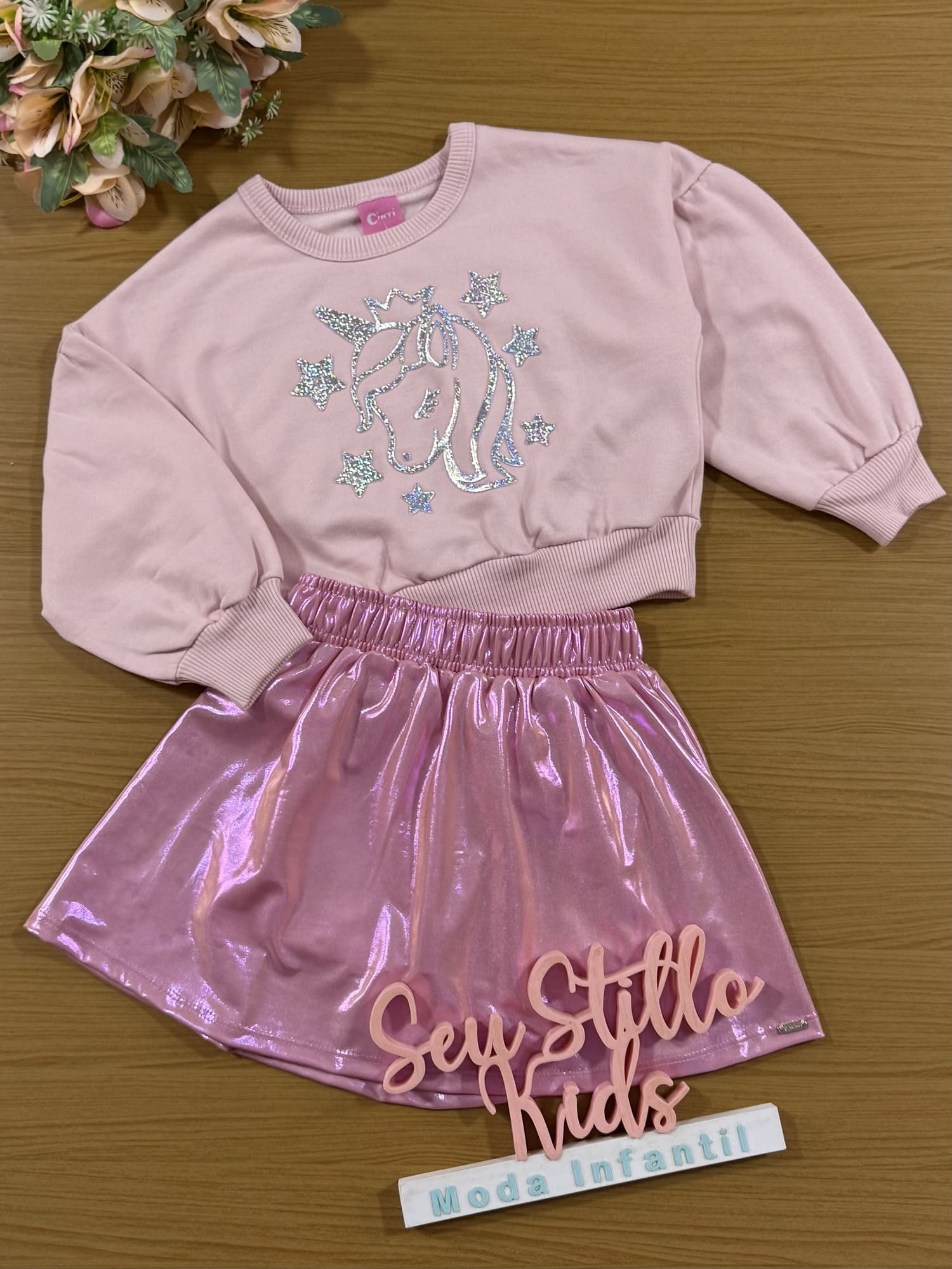 Conjunto Infantil Cinti Inverno Saia e Moletom Flanelado Rosa Unicórnio