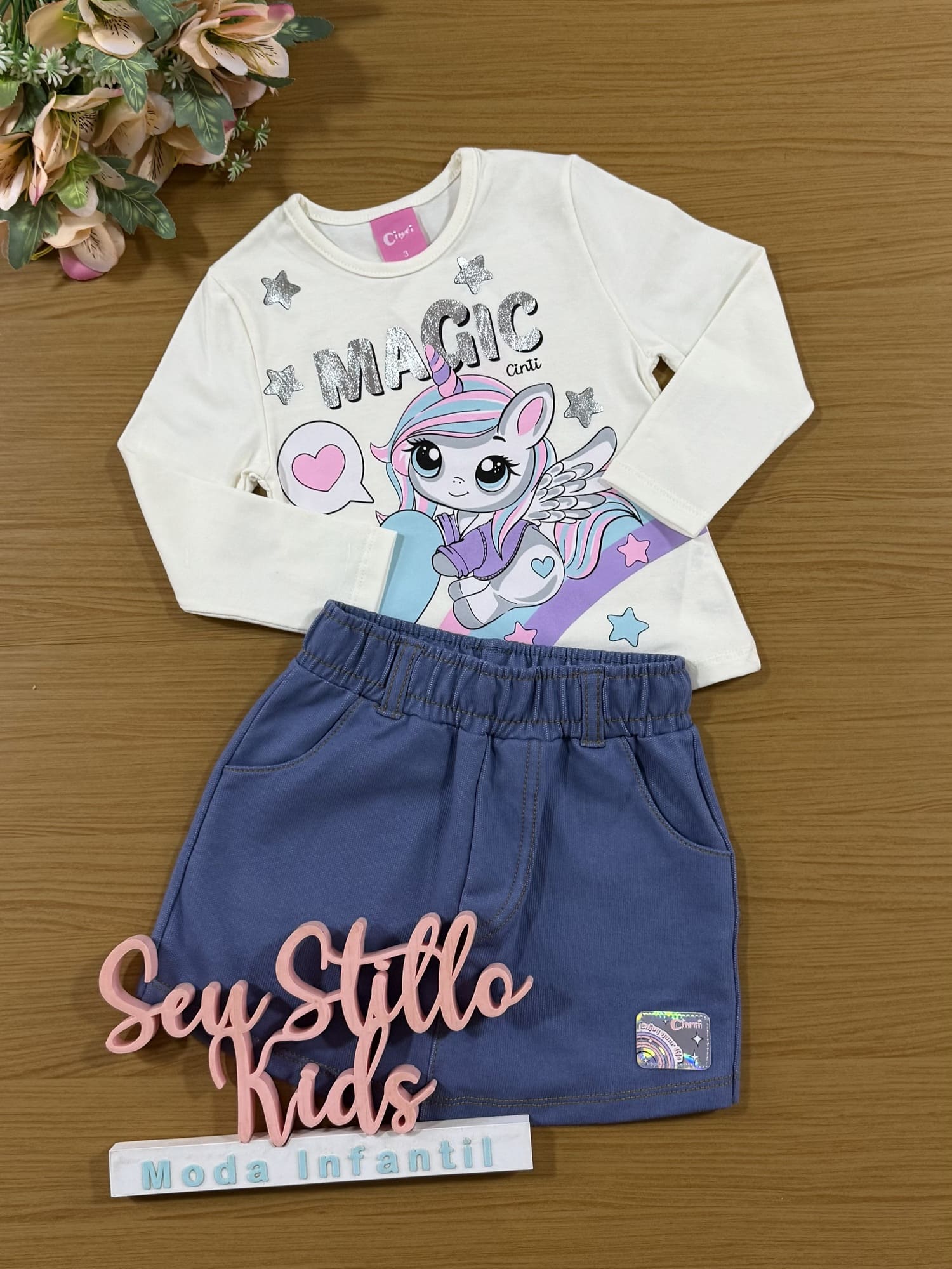 Conjunto Infantil Cinti Inverno Shorts Saia e Blusa Off White Unicórnio